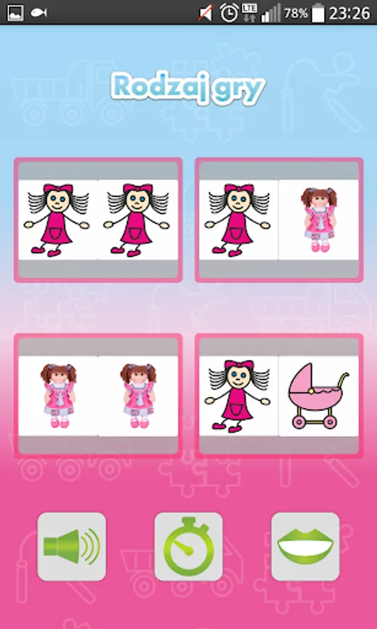 MÓWikMemory Toys is an application for practicing visual and auditory memory, and practicing associations. The application allows you to learn vocabulary. It has the ability to turn the voice on and off, and each picture says the name of the symbol. We can choose the mode: symbol and symbol, photo and symbol, photo and photo, symbol and association, and the possibility of grading the difficulty.