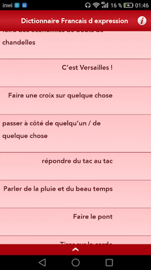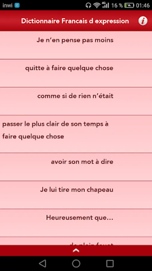 the application is free and easy to use with a good design and a random list of phrases to always find new phrases and definitions and to learn authentic French.