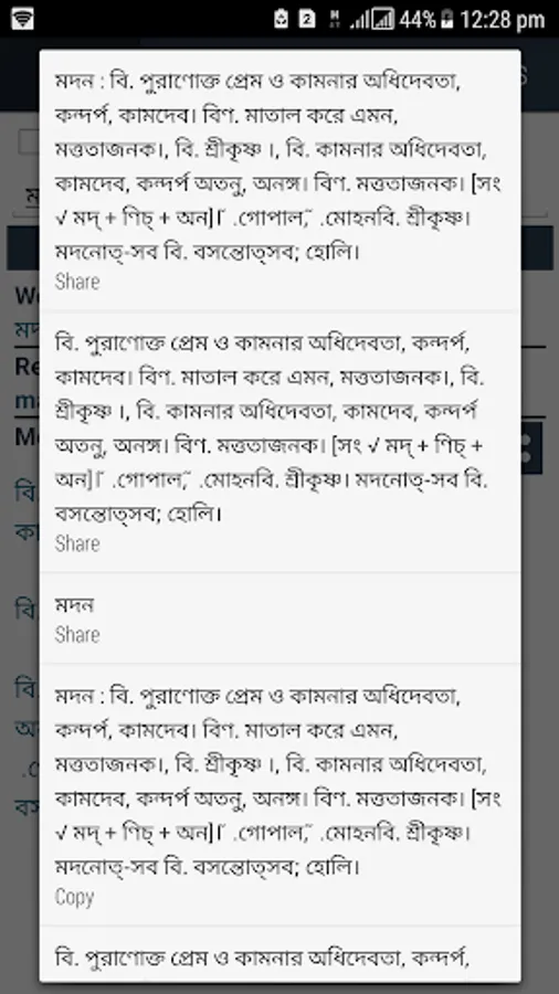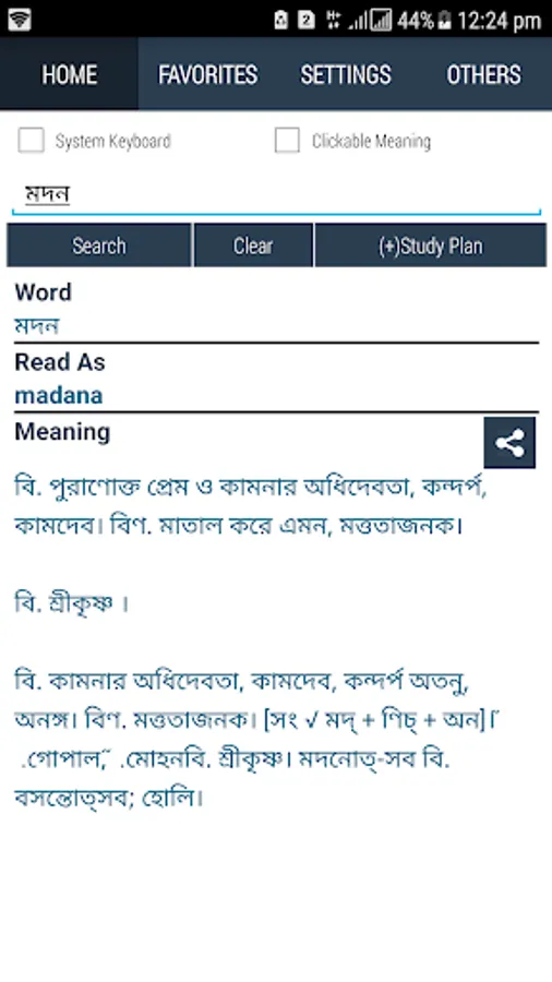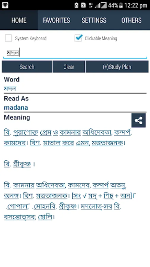 Bangla To Bangla Dictionary 100 % offline and free. You can search words directly from “Internet Browser” or other Applications by Sharing option. In sharing option you will find “Bangla to Bangla Dictionary” and choosing “Bangla to Bangla Dictionary” will open the dictionary with the shared word so you need not type and exiting from dictionary will return you to “Internet Browser” or other Applications again. This is not only a Dictionary but also a learning tool. You can use this dictionary when you have no internet connection. There is auto suggestion so you need not type full words. You can add words to study plan. And also you can remove words from study plan. You can turn on/off auto search going to setting of the app. So low profile Mobile handset can turn off Auto search to type quickly. You will see Dictionary icon on notification bar to start app quickly. On sharing text you will find Bangla To Bangla Dictionary. This will be helpful to find out meaning of any word.