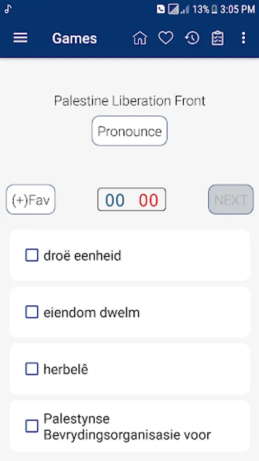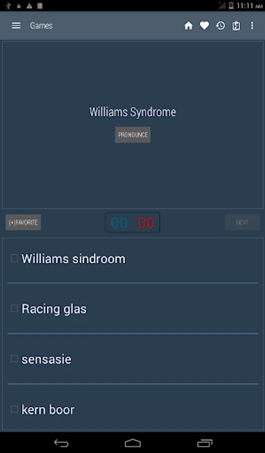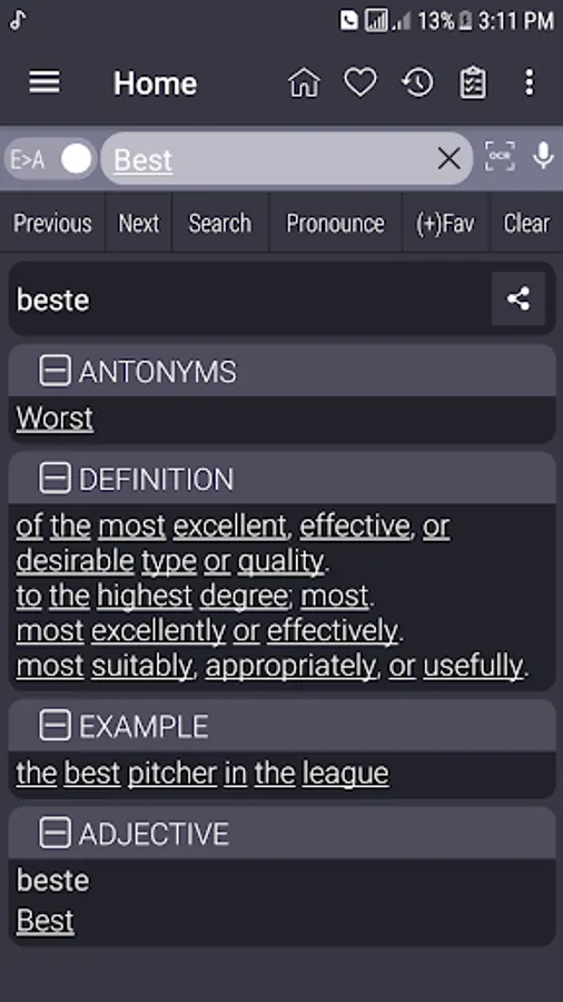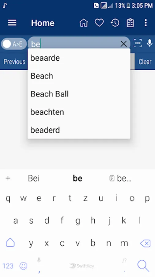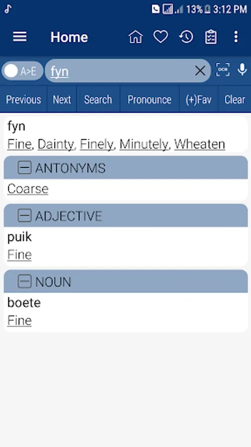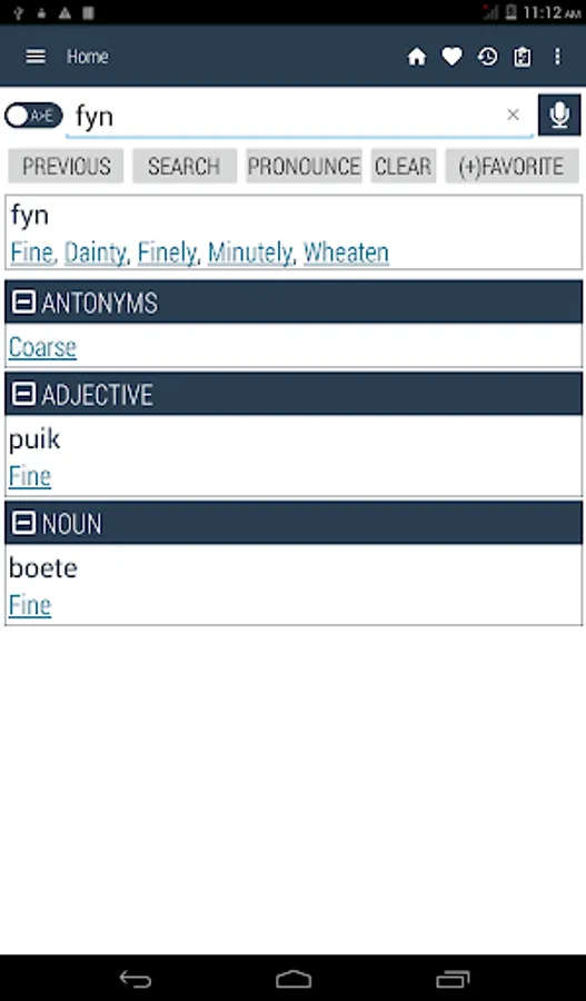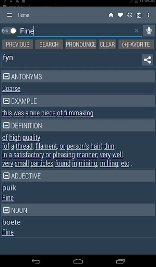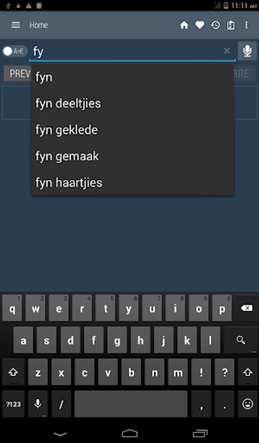 Afrikaans <> English Dictionary offline and free. You can search both English and Afrikaans words. You can search words directly from "Internet Browser" or other Applications by using Sharing option. In the sharing option you will find "Afrikaans Dictionary" and choosing "Afrikaans Dictionary" will open the dictionary with the shared word so you need not type. Exiting from the dictionary will return you to "Internet Browser" or other Applications again. This is not only a Dictionary but also a learning tool. You can use this dictionary when you have no Internet connection. MCQ (Multiple Choice Question) option is available. There is autosuggestion so you need not type full words. You also can use Speech to text feature. You can add words to the study plan and remove words from the study plan. When you start typing, you will see some words starting with the letters you typed. The dictionary searches in a database for the matching words. This can slow down typing in small handsets. Therefore in settings there is an option to turn that off. So low profile mobile handsets can turn off Auto search to type quickly. You will see a Dictionary icon on the notification bar to start the app quickly. On sharing text you will find the Afrikaans Dictionary. This will be helpful to find out the meaning of any word.