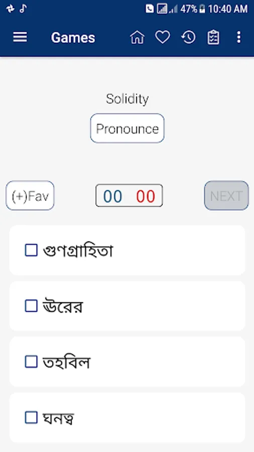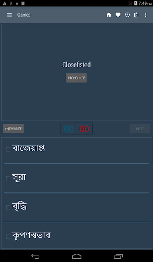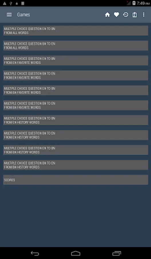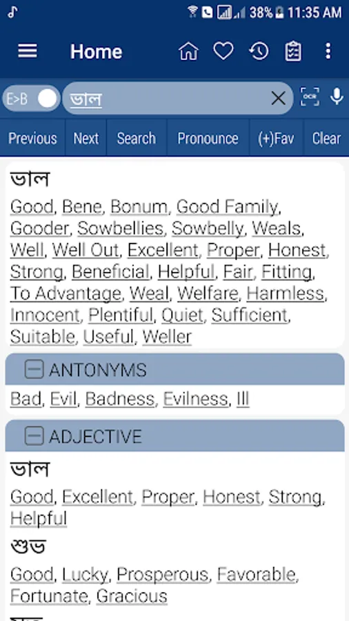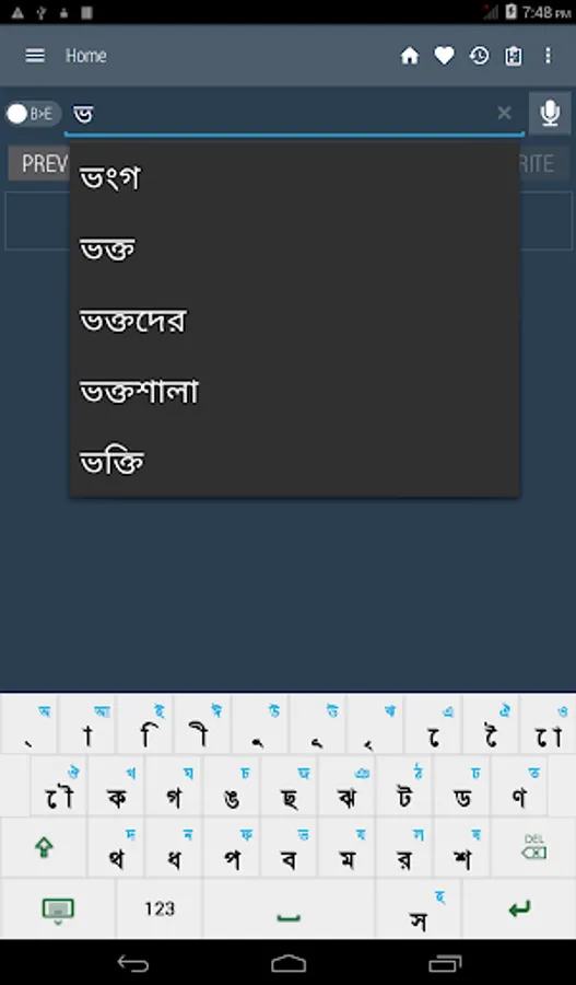 Bangla <> English Dictionary offline and free. You can search both English and Bangla words. You can search words directly from "Internet Browser" or other Applications by using Sharing option. In the sharing option you will find "Bangla Dictionary" and choosing "Bangla Dictionary" will open the dictionary with the shared word so you need not type. Exiting from the dictionary will return you to "Internet Browser" or other Applications again. This is not only a Dictionary but also a learning tool. You can use this dictionary when you have no Internet connection. MCQ (Multiple Choice Question) option is available. There is autosuggestion so you need not type full words. You also can use Speech to text feature. You can add words to the study plan and remove words from the study plan. When you start typing, you will see some words starting with the letters you typed. The dictionary searches in a database for the matching words. This can slow down typing in small handsets. Therefore in settings there is an option to turn that off. So low profile mobile handsets can turn off Auto search to type quickly. You will see a Dictionary icon on the notification bar to start the app quickly. On sharing text you will find the Bangla Dictionary. This will be helpful to find out the meaning of any word.