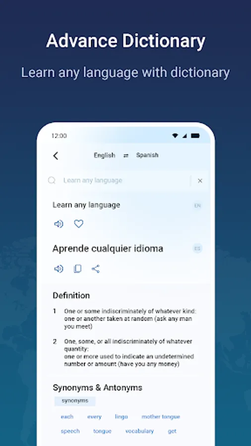 Dictionary & Translate app is one of the most comprehensive and accurate dictionary for all languages. The free dictionary of English provides definitions and translations for over 200 languages. An English dictionary for android is a reference work on the English language, specifically on the meaning of words. Free Dictionary and Translator app is a collection of words, each with its own meaning, definition, synonyms, and antonyms. A bilingual dictionary & word meaning app also includes a thesaurus and audio pronunciations. This is an offline medical dictionary app that includes a Spanish dictionary, French dictionary, German dictionary, Italian dictionary, Russian dictionary, Chinese dictionary, and many more. All Language Dictionary App is easy to use and provides a wealth of information. A powerful offline dictionary is perfect for students, travelers, and anyone who needs a quick reference.