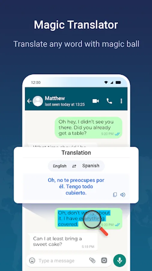 Free Dictionary app has a feature of Translate on screen. The Magic translator can translate among all languages. Just tap on the screen and translate the entire text. Translate on screen app for android recognize text on a mobile screen and translate it into the native language. Magic translation app is very fast to translate phone screen. Best medical dictionary for android.