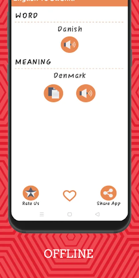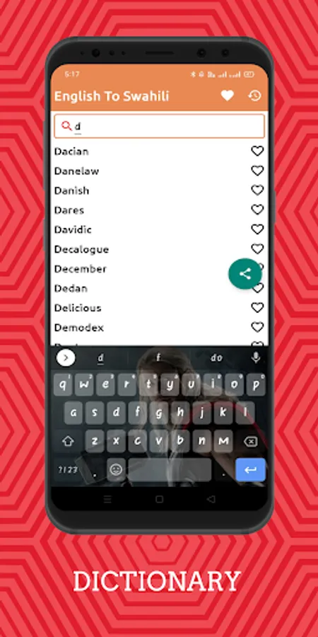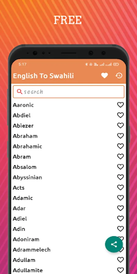 You can have a favorite list in the English Swahili dictionary also. The Swahili words will become your favorite during the use of the app, you can keep them as your favorite ones. In the Right hand of every word, a transparent heart-shaped icon is there. Tap on the heart icon and see it turning red just like Insta.