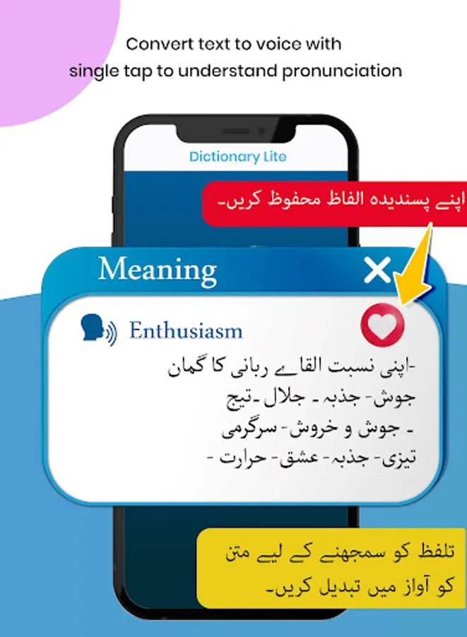 The dictionary translator app is not only an English dictionary but also a dictionary-learning tool app. English urdu dictionary offline translator You can use the app when the internet connection is unavailable. Dictionary english to urdu offline free translation is an auto-suggestion so you don't need to type the whole word. When you start typing in english to urdu translator book you'll notice that some words start with the letter you typed. English urdu translate dictionary searches the database for matching words. Urdu english translation dictionary can search for any word and then click on it to read its meaning in the Urdu language. English translate dictionary app meanings are displayed in real Urdu language not in the Roman language.