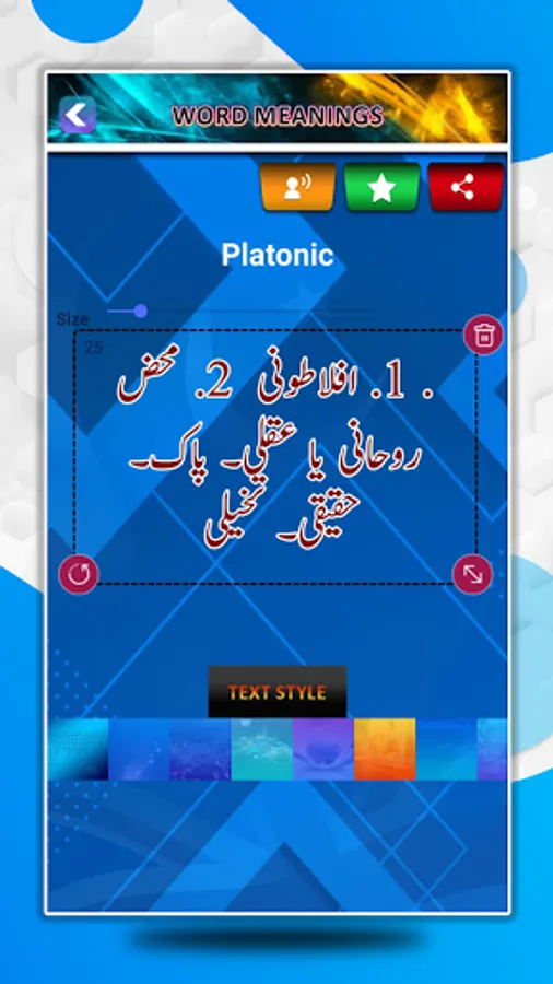 This is a 100% free dictionary translator app containing the features of English lexicons Offline and converts these into Urdu Offline dictionaries. Complete English to Urdu conversion is working just like an English to Urdu trainer with English translation support offline translate mode. You can also say it's a free English Dictionary. You can search for any English word; then, the search results will show you related converted words in Urdu. The app allows you to resize the font, customize the font color, and change the background of a searched word.