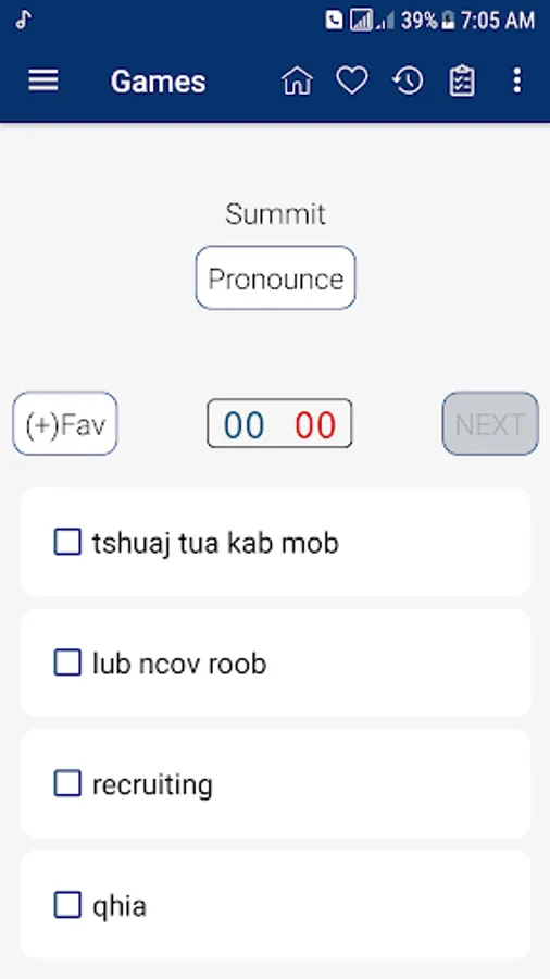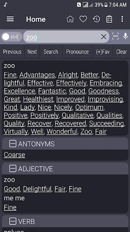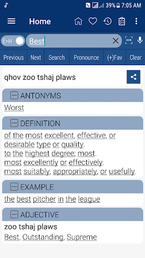 Hmong <> English Dictionary offline and free. You can search both English and Hmong words. You can search words directly from "Internet Browser" or other Applications by using Sharing option. In the sharing option you will find "Hmong Dictionary" and choosing "Hmong Dictionary" will open the dictionary with the shared word so you need not type. Exiting from the dictionary will return you to "Internet Browser" or other Applications again. This is not only a Dictionary but also a learning tool. You can use this dictionary when you have no Internet connection. MCQ (Multiple Choice Question) option is available. There is autosuggestion so you need not type full words. You also can use Speech to text feature. You can add words to the study plan and remove words from the study plan. When you start typing, you will see some words starting with the letters you typed. The dictionary searches in a database for the matching words. This can slow down typing in small handsets. Therefore in settings there is an option to turn that off. So low profile mobile handsets can turn off Auto search to type quickly. You will see a Dictionary icon on the notification bar to start the app quickly. On sharing text you will find the Hmong Dictionary. This will be helpful to find out the meaning of any word.