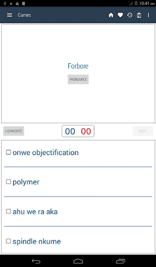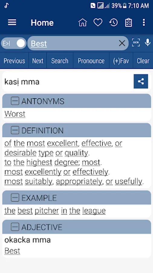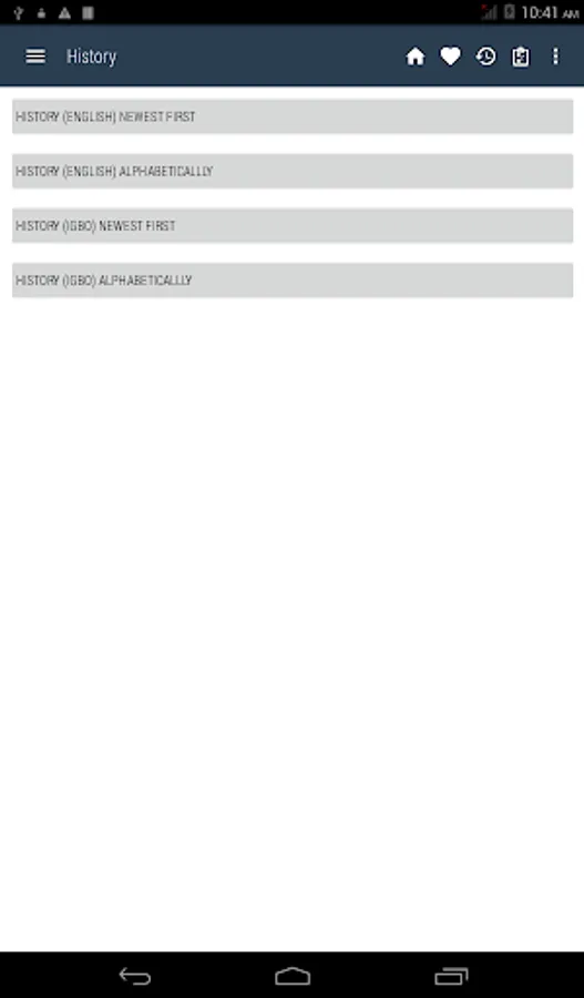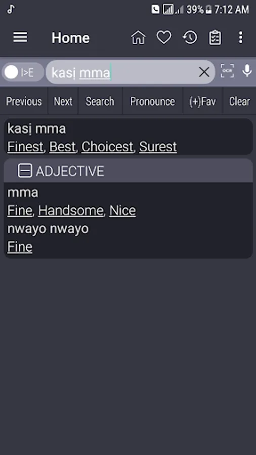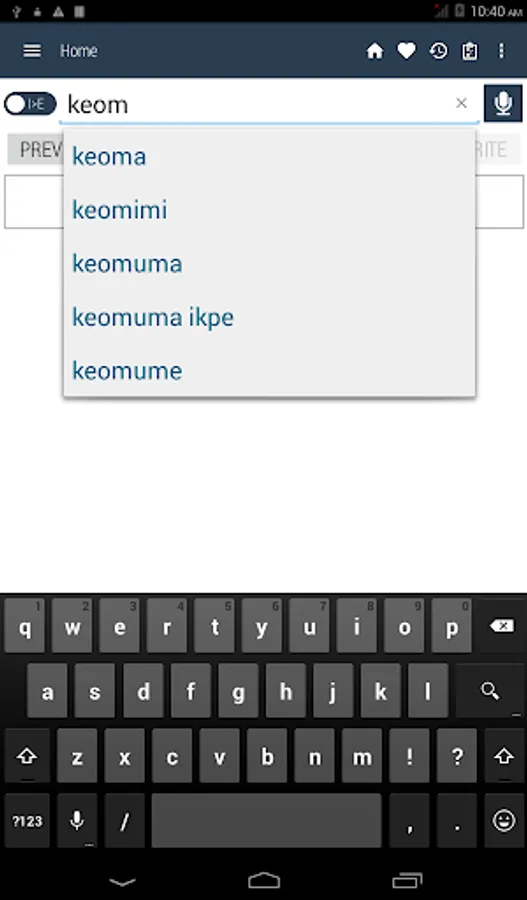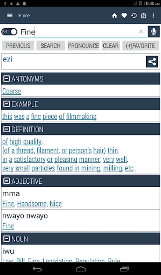 Igbo <> English Dictionary offline and free. You can search both English and Igbo words. You can search words directly from "Internet Browser" or other Applications by using Sharing option. In the sharing option you will find "Igbo Dictionary" and choosing "Igbo Dictionary" will open the dictionary with the shared word so you need not type. Exiting from the dictionary will return you to "Internet Browser" or other Applications again. This is not only a Dictionary but also a learning tool. You can use this dictionary when you have no Internet connection. MCQ (Multiple Choice Question) option is available. There is autosuggestion so you need not type full words. You also can use Speech to text feature. You can add words to the study plan and remove words from the study plan. When you start typing, you will see some words starting with the letters you typed. The dictionary searches in a database for the matching words. This can slow down typing in small handsets. Therefore in settings there is an option to turn that off. So low profile mobile handsets can turn off Auto search to type quickly. You will see a Dictionary icon on the notification bar to start the app quickly. On sharing text you will find the Igbo Dictionary. This will be helpful to find out the meaning of any word.