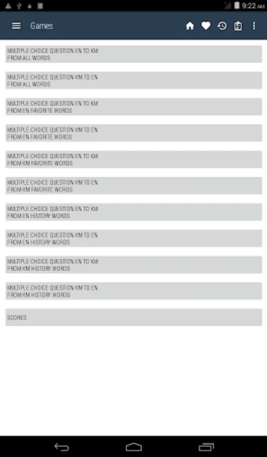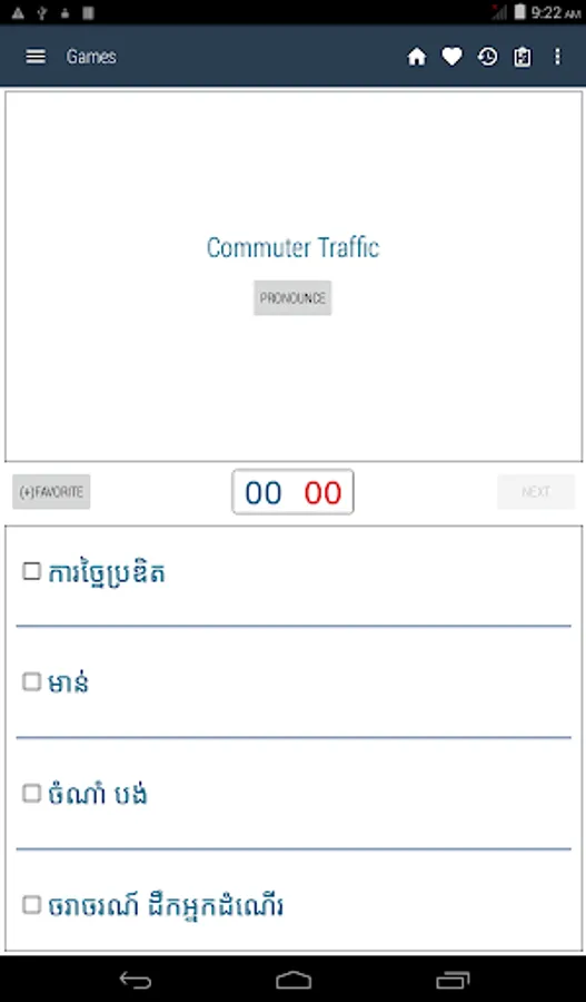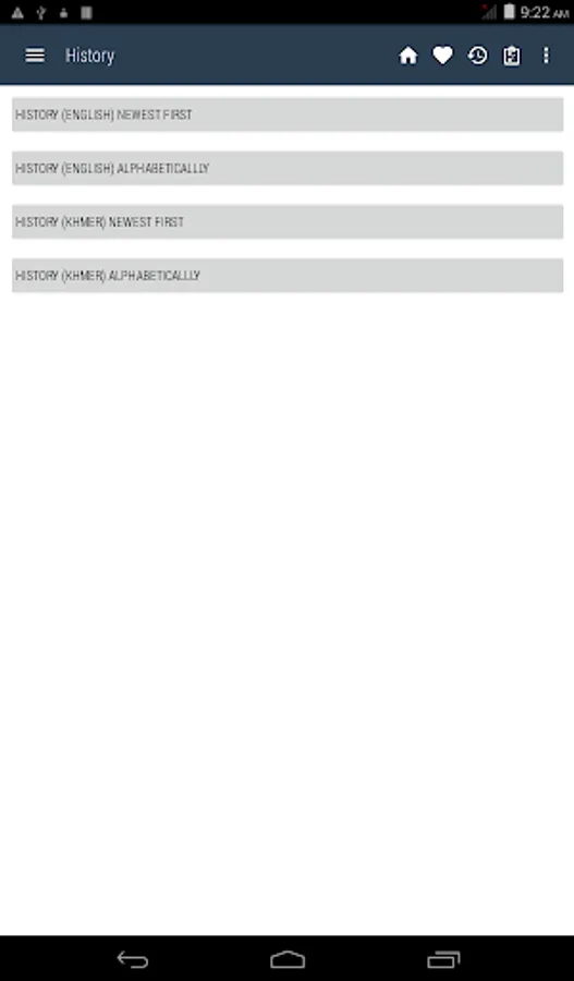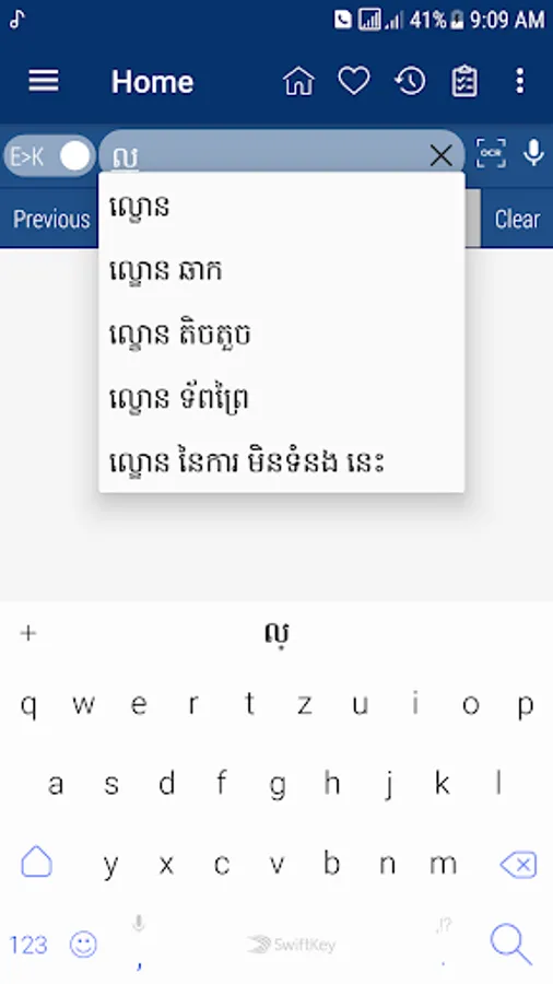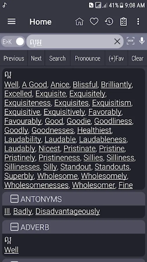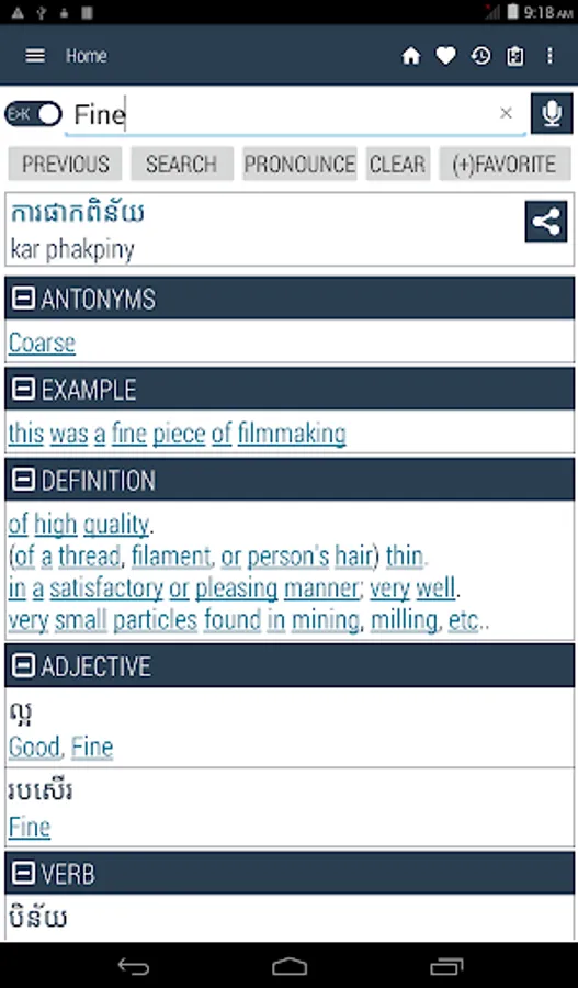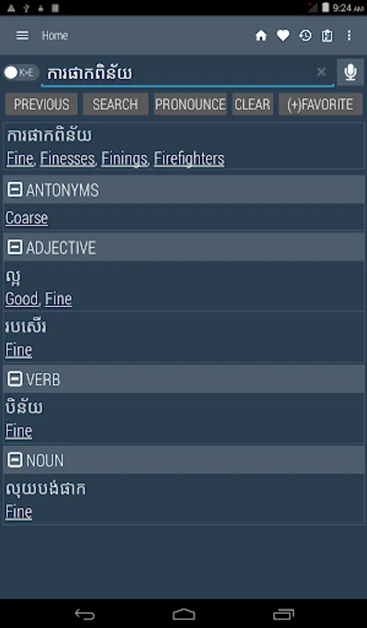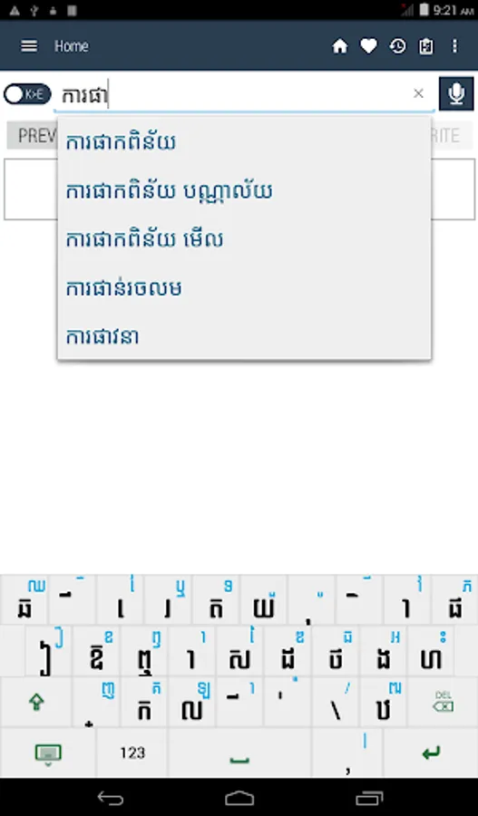 Khmer <> English Dictionary offline and free. You can search both English and Khmer words. You can search words directly from "Internet Browser" or other Applications by using Sharing option. In the sharing option you will find "Khmer Dictionary" and choosing "Khmer Dictionary" will open the dictionary with the shared word so you need not type. Exiting from the dictionary will return you to "Internet Browser" or other Applications again. This is not only a Dictionary but also a learning tool. You can use this dictionary when you have no Internet connection. MCQ (Multiple Choice Question) option is available. There is autosuggestion so you need not type full words. You also can use Speech to text feature. You can add words to the study plan and remove words from the study plan. When you start typing, you will see some words starting with the letters you typed. The dictionary searches in a database for the matching words. This can slow down typing in small handsets. Therefore in settings there is an option to turn that off. So low profile mobile handsets can turn off Auto search to type quickly. You will see a Dictionary icon on the notification bar to start the app quickly. On sharing text you will find the Khmer Dictionary. This will be helpful to find out the meaning of any word.
