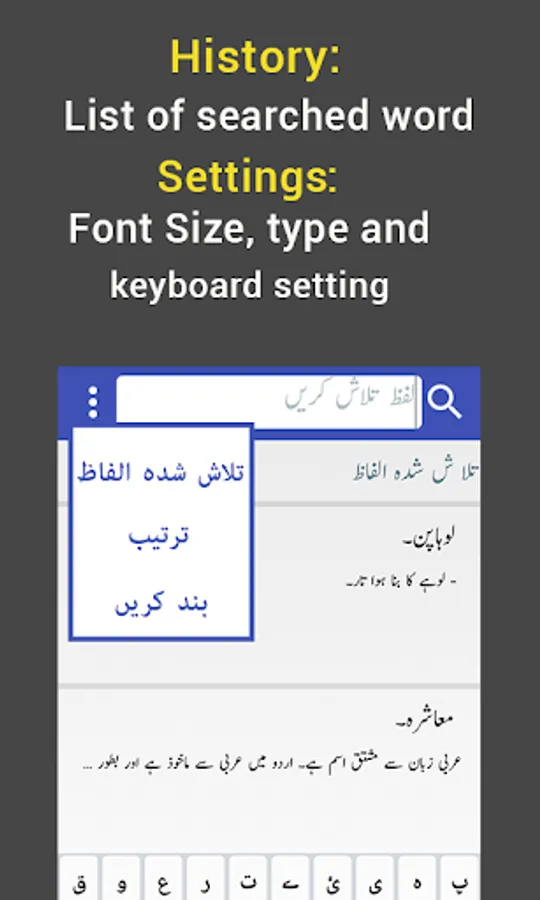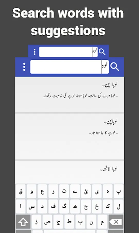 Offline Urdu Lughat is the best offline Urdu Dictionary to search for Urdu word and meanings, it is the least available Urdu to Urdu dictionary with complete details of a word. more than 2 lack words are waiting for you in Urdu Lughat Dictionary to learn urdu language. Urdu Lughat provide custom keyboard for urdu, its is beautyfull Urdu keyboard which can be used as Urdu keyboards to search a word.