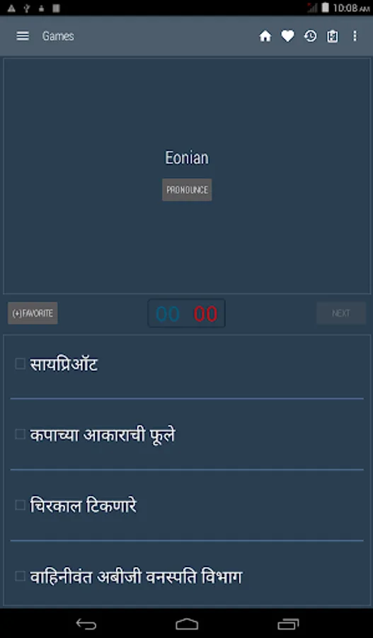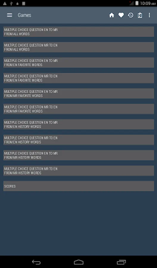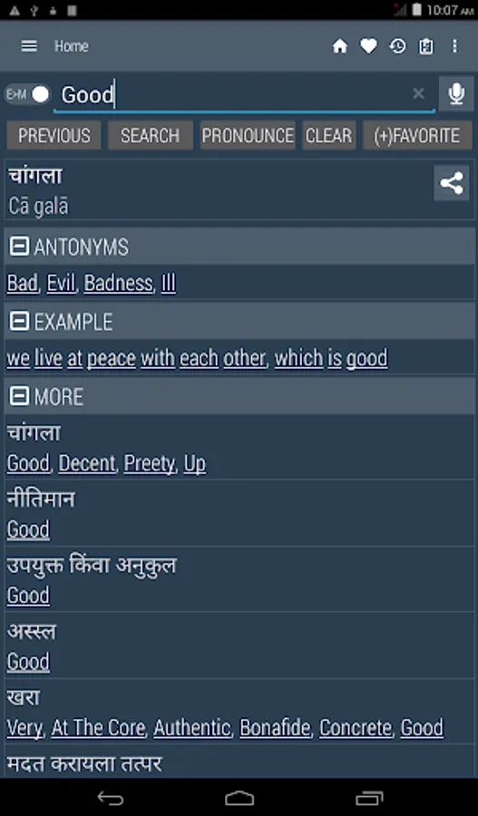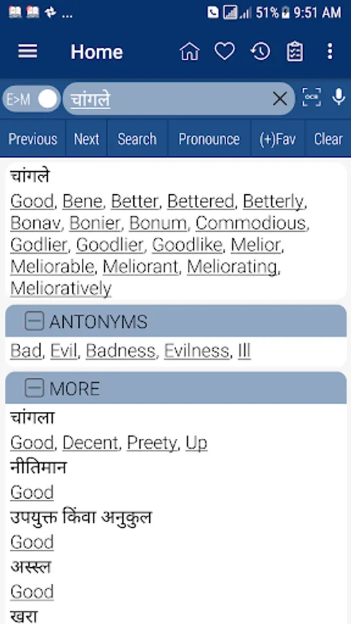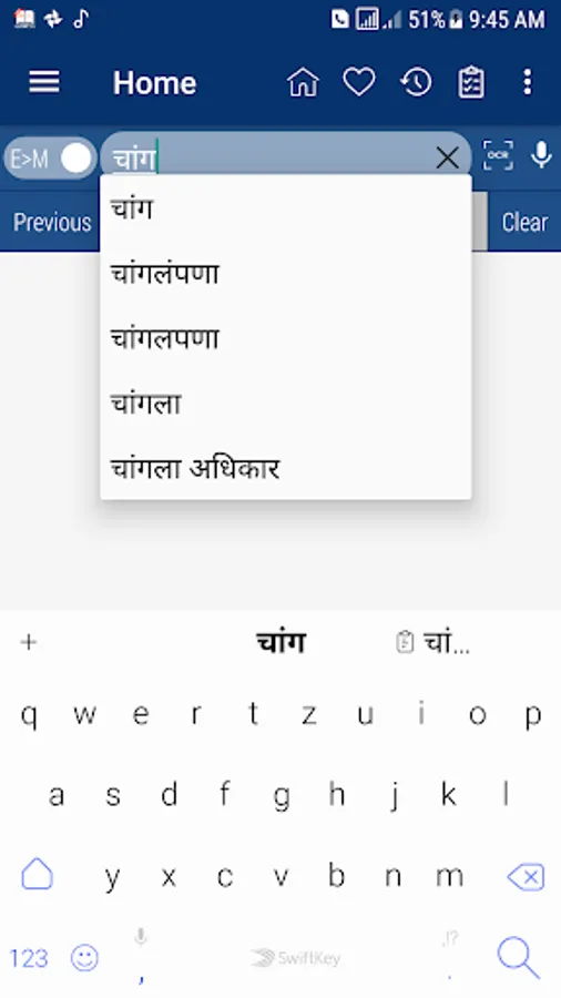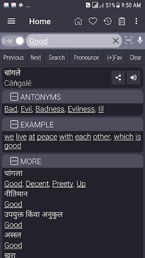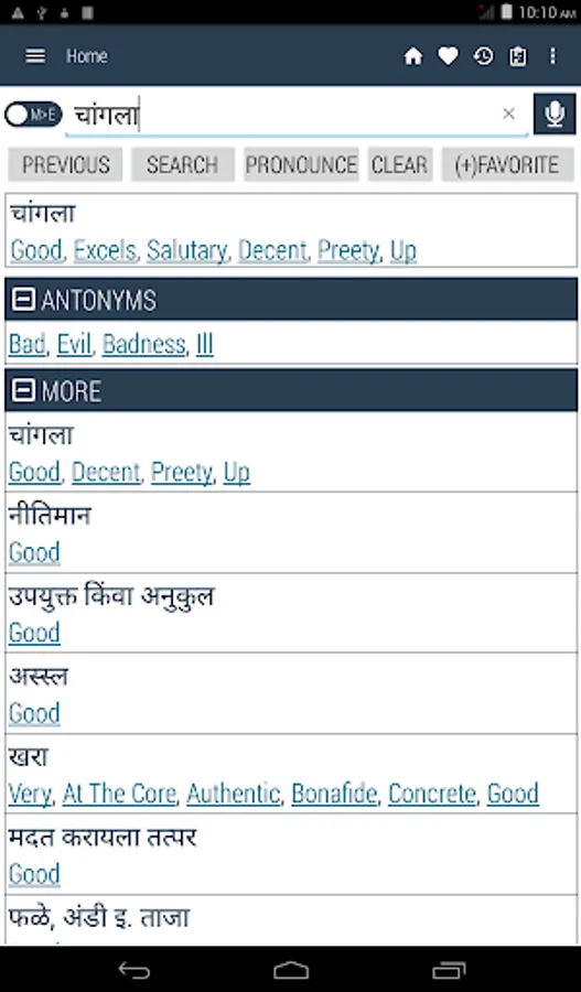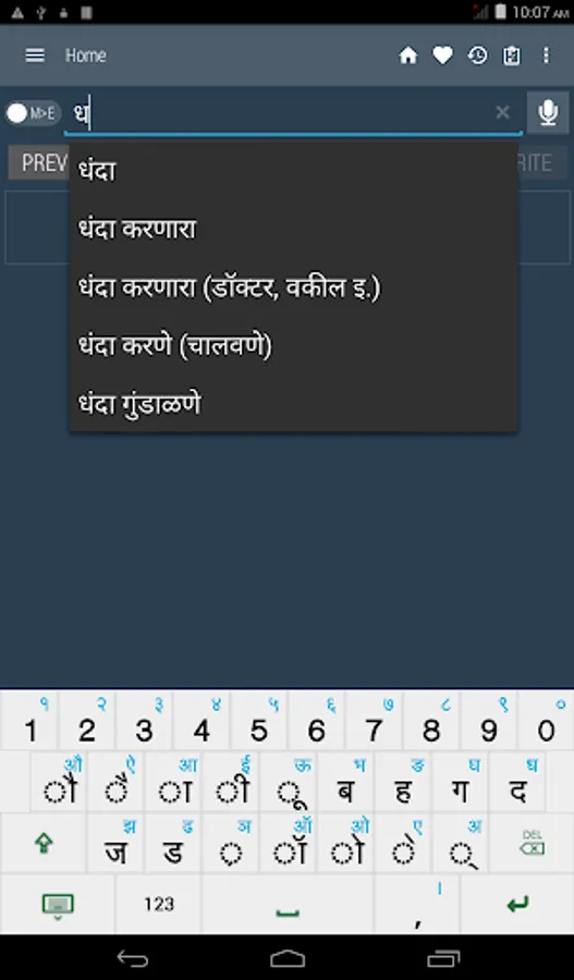 Marathi <> English Dictionary offline and free. You can search both English and Marathi words. You can search words directly from "Internet Browser" or other Applications by using Sharing option. In the sharing option you will find "Marathi Dictionary" and choosing "Marathi Dictionary" will open the dictionary with the shared word so you need not type. Exiting from the dictionary will return you to "Internet Browser" or other Applications again. This is not only a Dictionary but also a learning tool. You can use this dictionary when you have no internet connection. MCQ (Multiple Choice Question) option is available. There is auto suggestion so you need not type full words. You also can use Speech to text feature . You can add words to the study plan and remove words from the study plan. When you start typing, you will see some words starting with the letters you typed. The dictionary searches in a database for the matching words. This can slow down typing in small handsets. Therefore in settings there is an option to turn that off. So low profile mobile handsets can turn off Auto search to type quickly. You will see a Dictionary icon on the notification bar to start the app quickly. On sharing text you will find the Marathi Dictionary. This will be helpful to find out the meaning of any word.