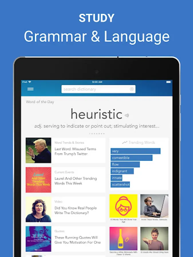 With more than 2 million trusted definitions and synonyms plus word puzzles, language quizzes, and spelling quizzes, this English dictionary and thesaurus app for Android is optimized with your mobile device in mind to help you learn English or improve your English vocabulary.