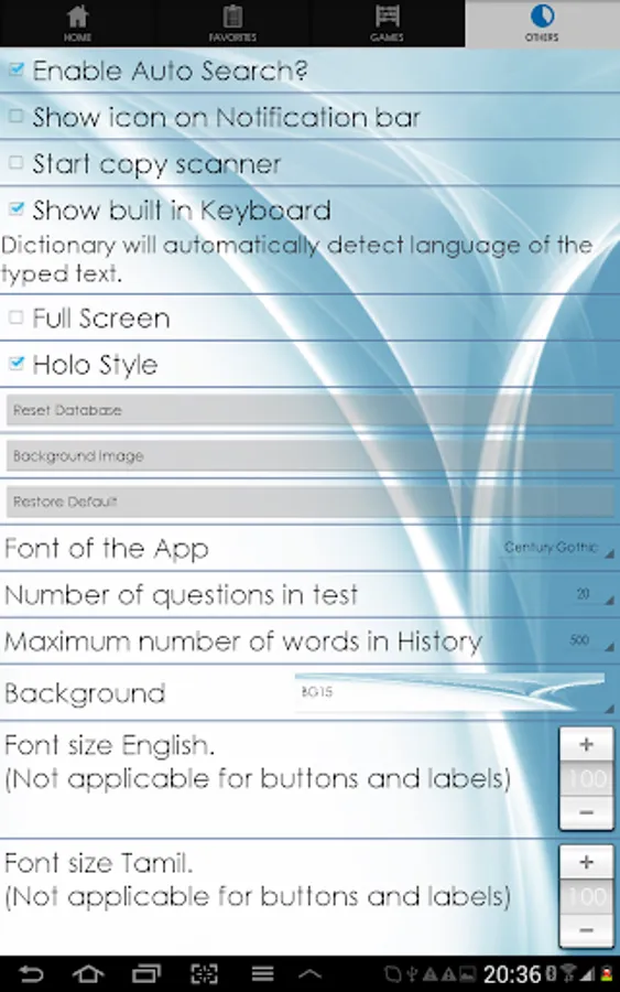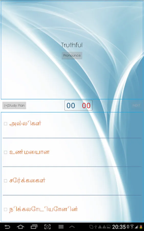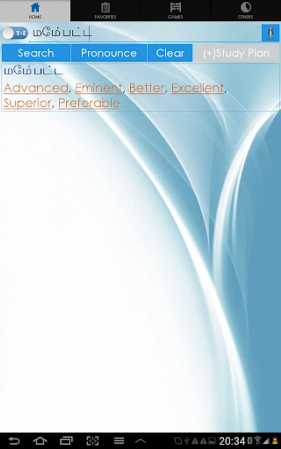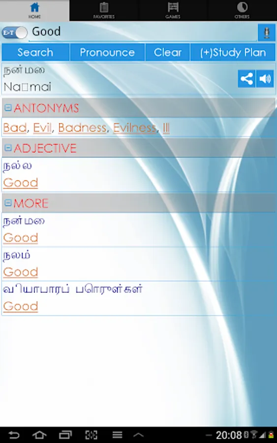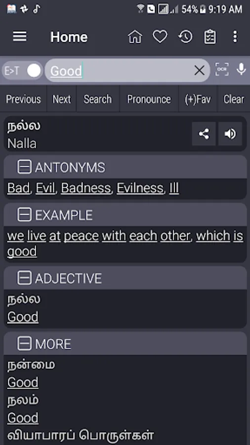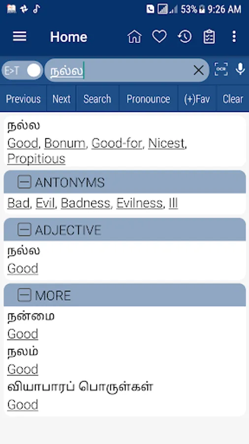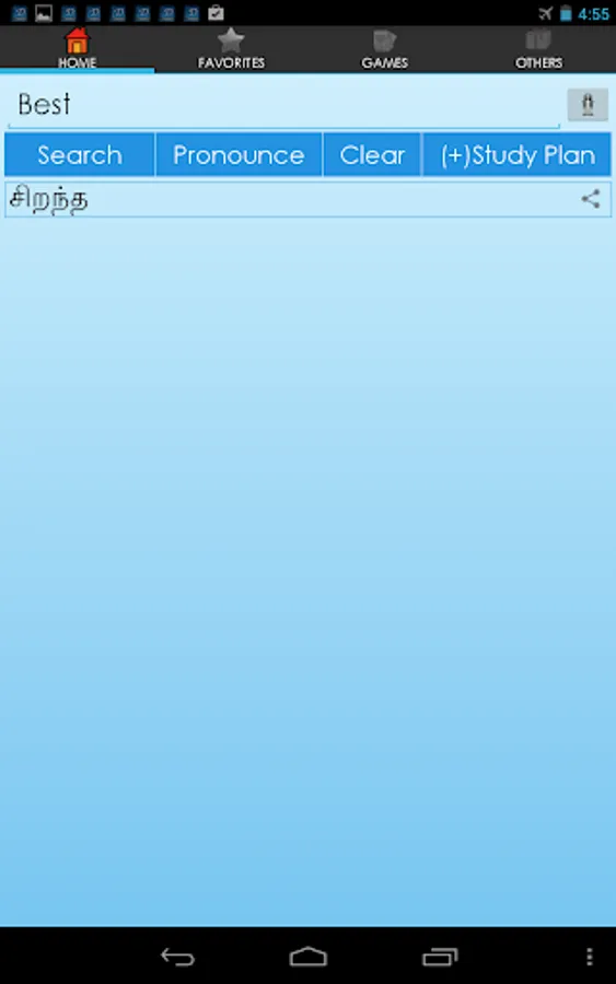 Tamil <> English Dictionary offline and free. You can search both English and Tamil words. You can search words directly from "Internet Browser" or other Applications by using Sharing option. In the sharing option you will find "Tamil Dictionary" and choosing "Tamil Dictionary" will open the dictionary with the shared word so you need not type. Exiting from the dictionary will return you to "Internet Browser" or other Applications again. This is not only a Dictionary but also a learning tool. You can use this dictionary when you have no Internet connection. MCQ (Multiple Choice Question) option is available. There is autosuggestion so you need not type full words. You also can use Speech to text feature. You can add words to the study plan and remove words from the study plan. When you start typing, you will see some words starting with the letters you typed. The dictionary searches in a database for the matching words. This can slow down typing in small handsets. Therefore in settings there is an option to turn that off. So low profile mobile handsets can turn off Auto search to type quickly. You will see a Dictionary icon on the notification bar to start the app quickly. On sharing text you will find the Tamil Dictionary. This will be helpful to find out the meaning of any word.
