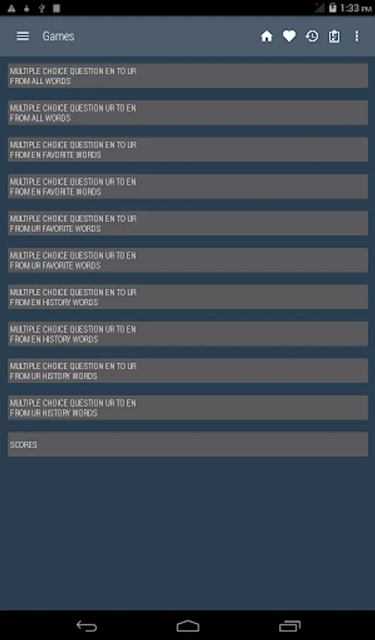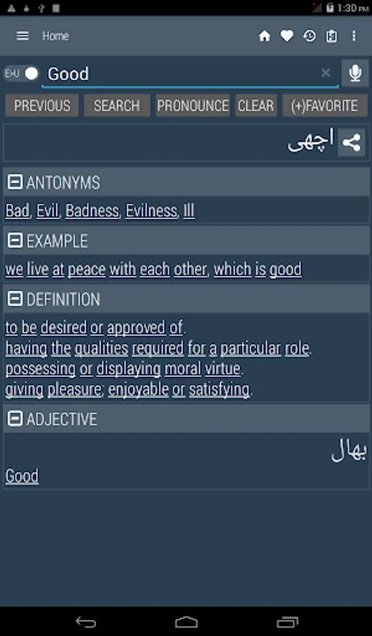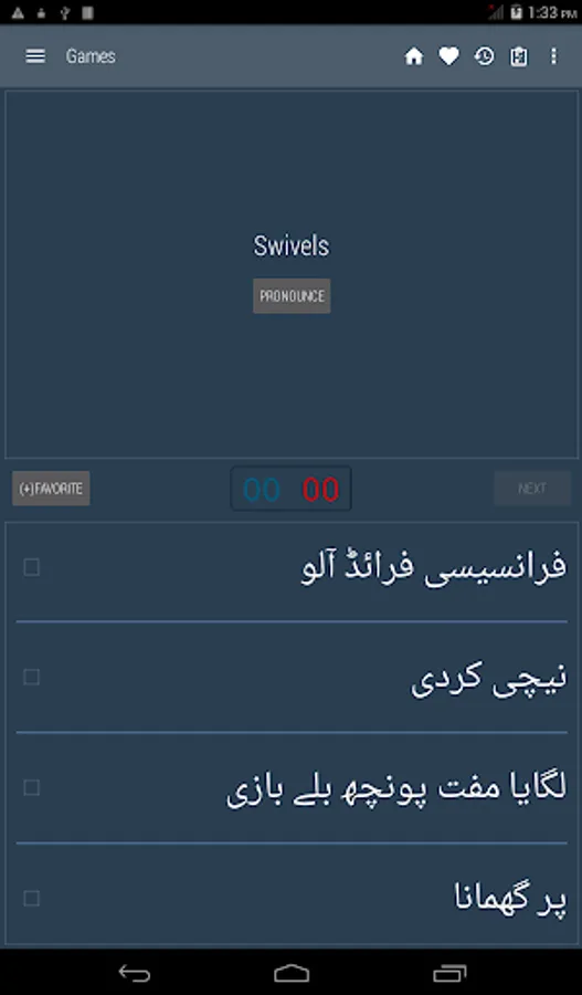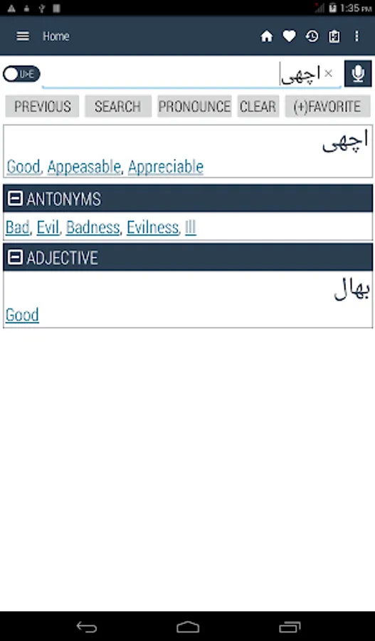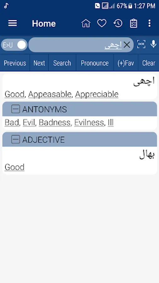 Urdu <> English Dictionary offline and free. You can search both English and Urdu words. You can search words directly from "Internet Browser" or other Applications by using Sharing option. In the sharing option you will find "Urdu Dictionary" and choosing "Urdu Dictionary" will open the dictionary with the shared word so you need not type. Exiting from the dictionary will return you to "Internet Browser" or other Applications again. This is not only a Dictionary but also a learning tool. You can use this dictionary when you have no internet connection. MCQ (Multiple Choice Question) option is available. There is auto suggestion so you need not type full words. You also can use Speech to text feature . You can add words to the study plan and remove words from the study plan. When you start typing, you will see some words starting with the letters you typed. The dictionary searches in a database for the matching words. This can slow down typing in small handsets. Therefore in settings there is an option to turn that off. So low profile mobile handsets can turn off Auto search to type quickly. You will see a Dictionary icon on the notification bar to start the app quickly. On sharing text you will find the Urdu Dictionary. This will be helpful to find out the meaning of any word.