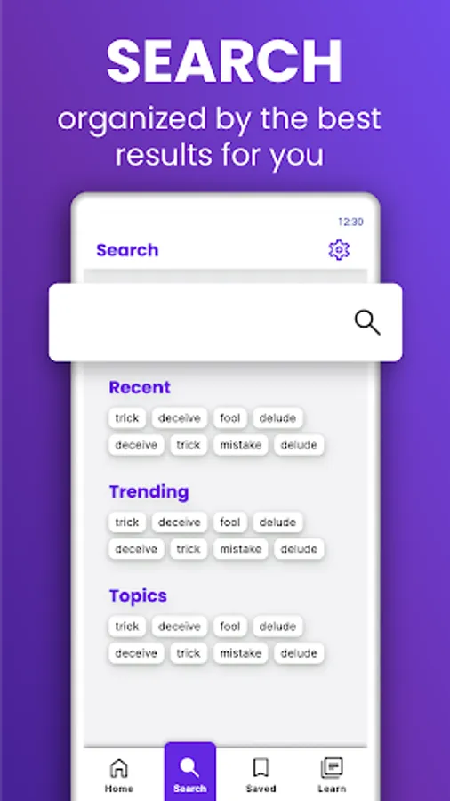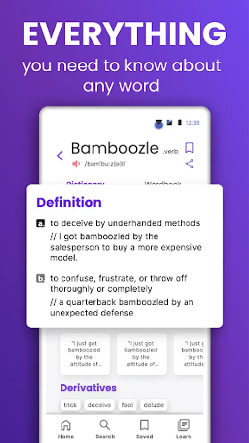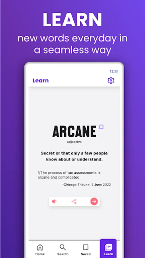 Keep learning more words in a seamless way in the learning page, just keep swiping and learning, then save the ones you like the most and look further into them