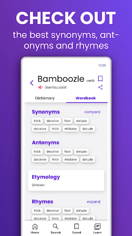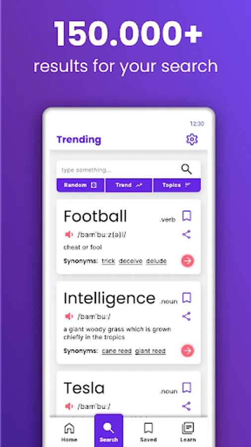 With more than 150.000 English words (and increasing), you can look into our app to always find the best fit for your schoolwork, project or that word that you wanted to know what it means. You can experience in first-hand our multiple features, including Unlimited saved words for your to keep while offline, Synonyms, antonyms, rhymes, Contexts of Use and more