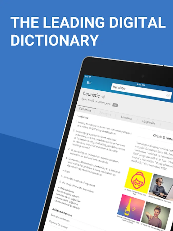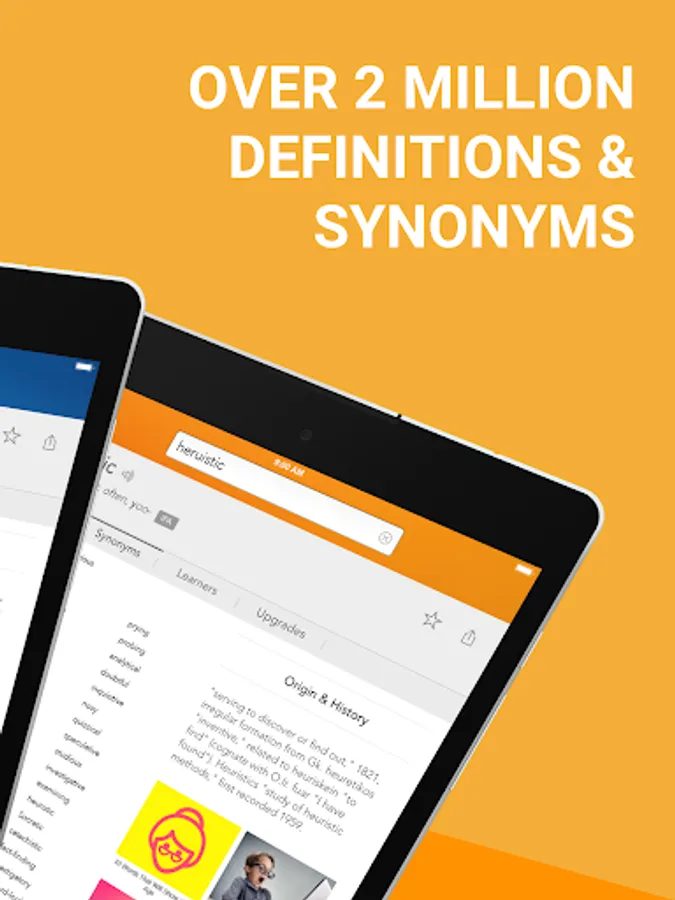 With more than 2 million trusted definitions and synonyms, the Dictionary.com English dictionary and thesaurus app for Android is optimized with your mobile device in mind to help you learn English or improve your English vocabulary. It even works offline! Install the offline dictionary for access to definitions and synonyms whenever and wherever you need them — no bulky books necessary.