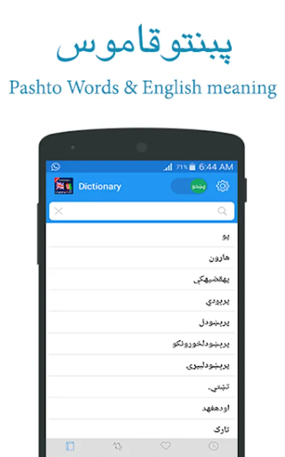 Word of the Day Feature – The pashto to English and English to pashto dictionary also comes with a word of the day feature that allows you to learn a new pashto word and its English meaning every day. With such convert pashto to English feature you can easily build your pashto vocabulary.