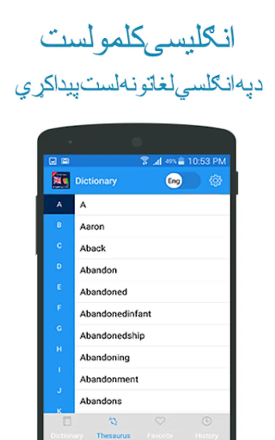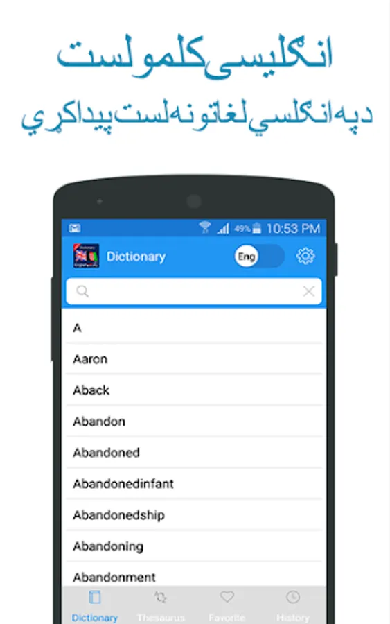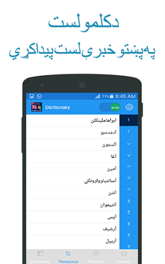 Vocabulary Learning – This pashto to English dictionary and English to pashto dictionary app allows you to learn English and pashto at the same time. You can use this app as a pashto to English converter and an English to pashto converter to learn words meanings of both the languages. The pashto thesaurus feature in the app gives you a long and extensive list of pashto words and by tapping any one of them you can easily find the English meanings of such words. Similarly, you can go into the English words thesaurus and find pashto meanings of the words. This vocabulary learning feature can help you in your future pashto to English translation and English to pashto translation.