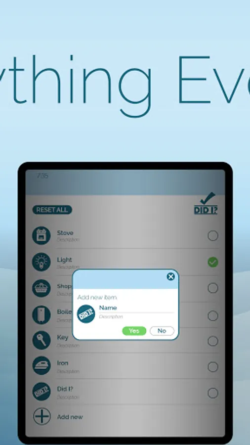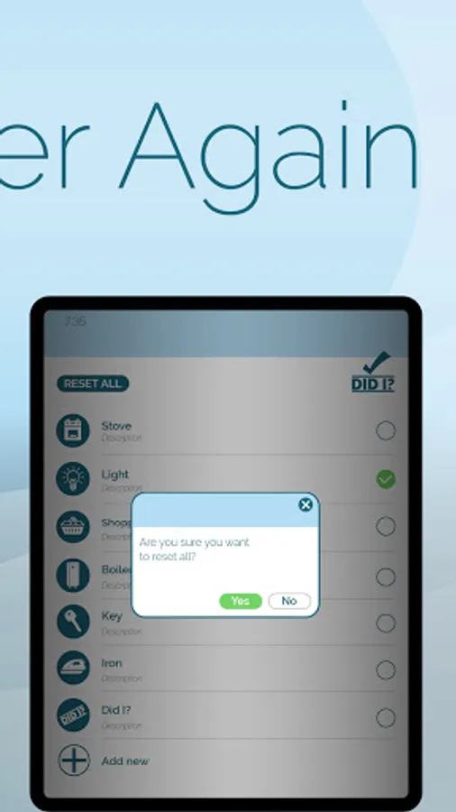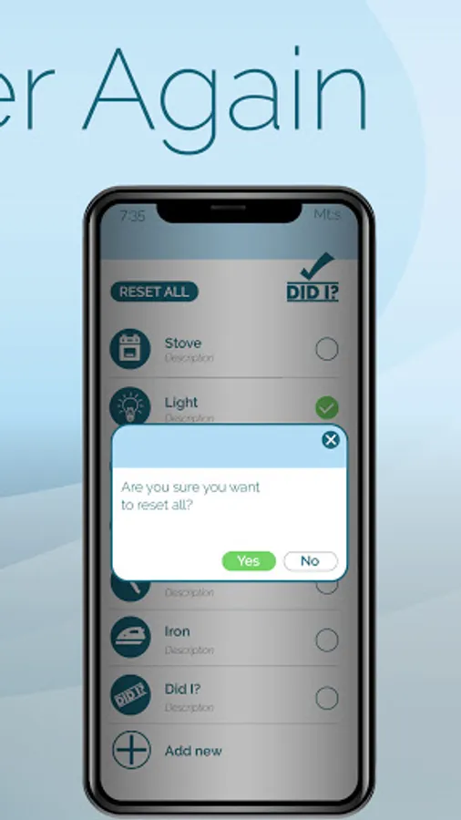 Never again delete your list of tasks by accident. By tapping on the Reset all button pop-up box will appear so you won’t lose your list if you are in a hurry.