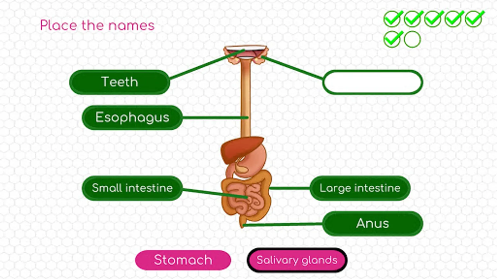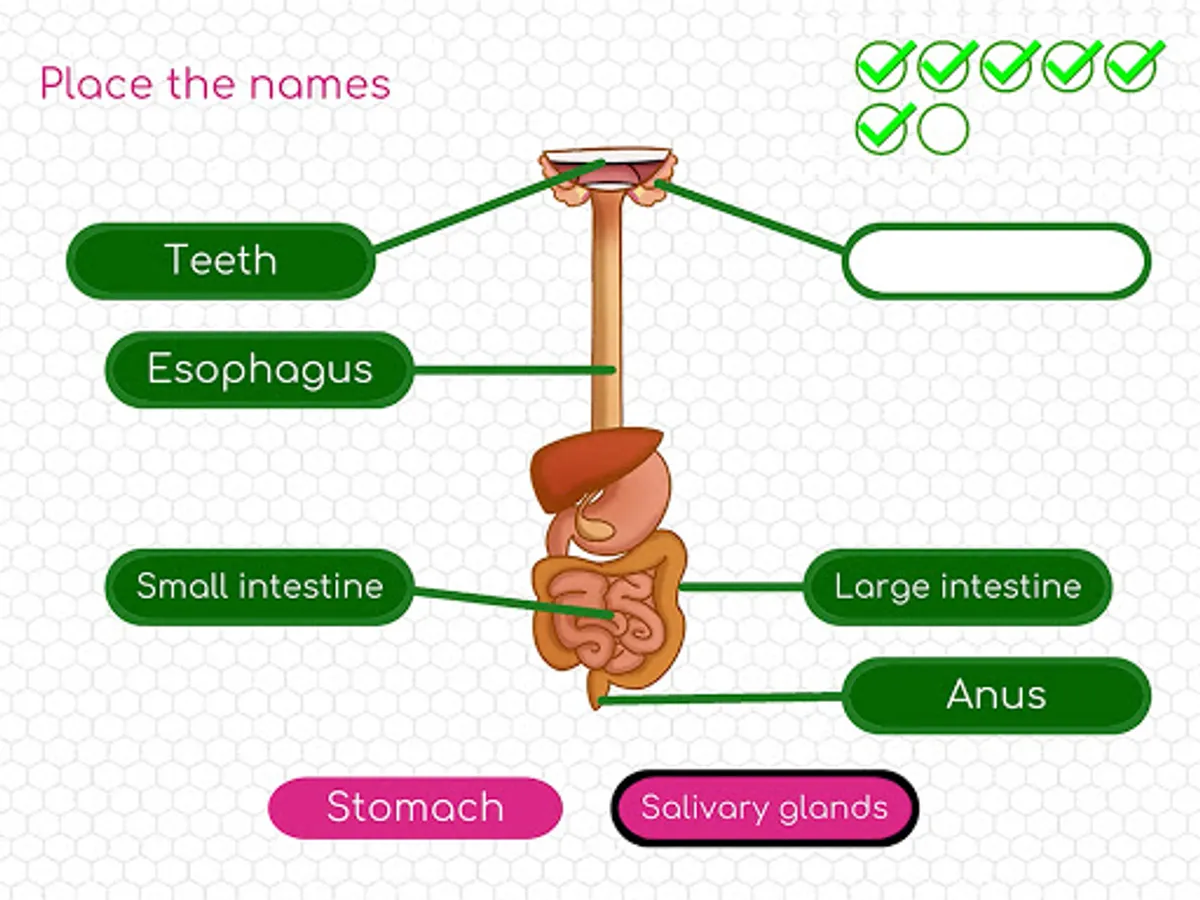 . Digestive system: Parts and their function in the digestion process, food wheel for a balanced diet, different foods and their nutrients.