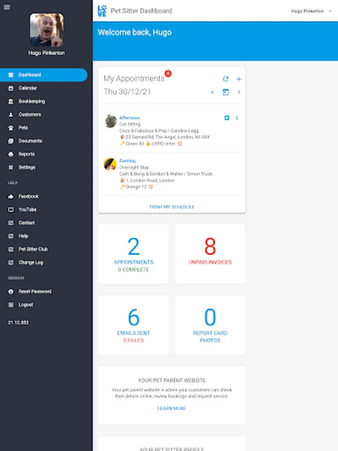Pet Sitter Dashboard helps pet sitters, dog walkers, kennels and groomers manage their business via a FREE app and website.