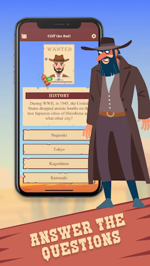 Are you ready to be the fastest gun in the Wild West quiz app? Speed and accuracy will be key when responding to trivia questions before other players. So, dust off your quick draw skills as time is not on your side! A perfect score requires fast reflexes, a sharp memory and knowledge on a variety of topics. Don't worry - it's fun for all levels of players; those who want a relaxing trivia challenge or those who are looking for a wild shootout! Getting the questions right is all up to you but, be warned: whoever hesitates, loses their chance at fame in the Wild West!