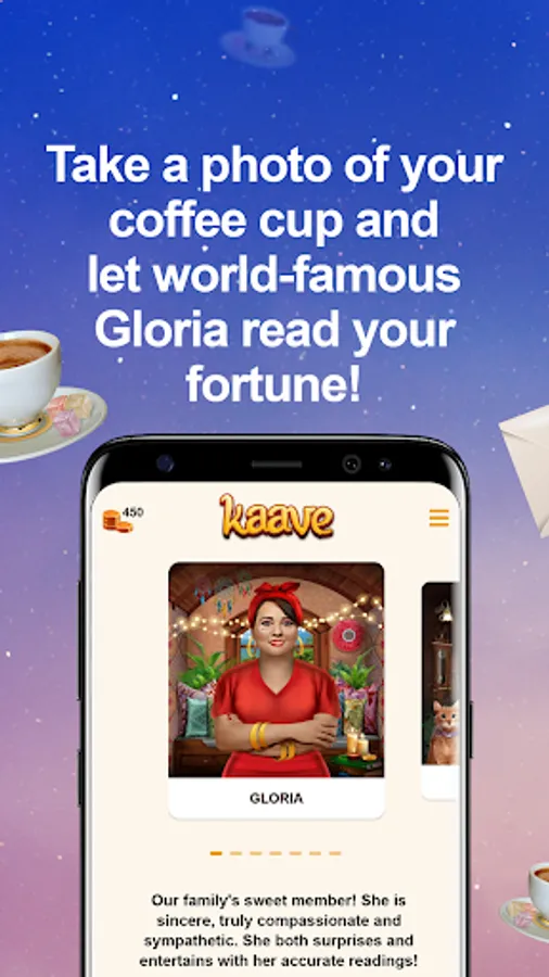 Gloria and her friends, who bring over 50 million users from the four corners of the world together with their fortunes and readings, are the new faces of a mystical tradition spanning the ages. Kaave is the first and only app which offers real fortune tellers and readers and an advanced artificial intelligence that has been taught human intuition.