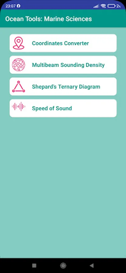 The aim of the "Ocean Tools: Marine Science" app is to develop useful tools for use in the planning and development of oceanographic surveys. It is not about providing tools that perform large calculations or processing, but rather Ocean Tools is focused on algorithms to perform small calculations on a day-to-day basis during the planning and execution of oceanographic campaigns.