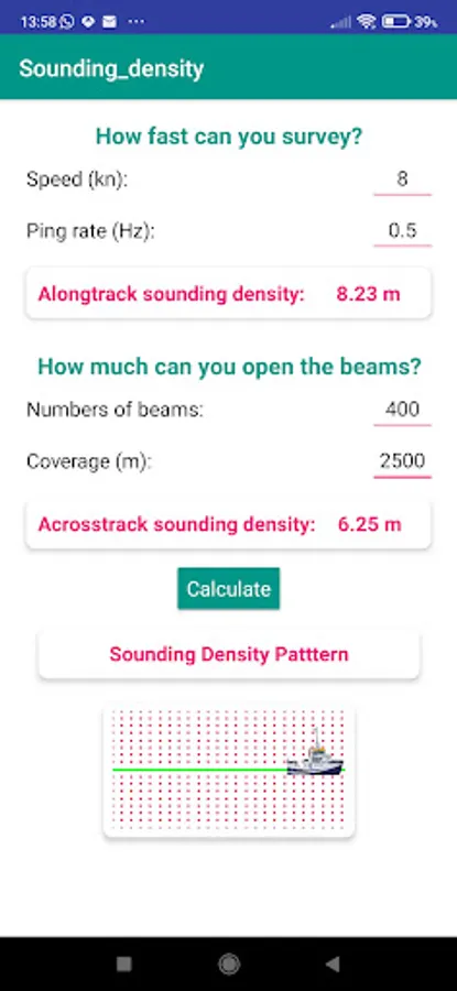 2. .- Multibeam Sounding density: It calculates the spatial resolution or density of soundings using a multibeam echosounder. Along-track and across-track densities depend on vessel speed, ping rate, number of beams and coverage.