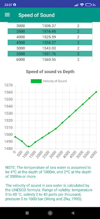 4. Sound velocity calculator: Calculates the velocity of sound in seawater and draws the chart. The Velocity of sound in sea-water changes with water pressure, temperature, and salinity. It is calculated by UNESCO formula.