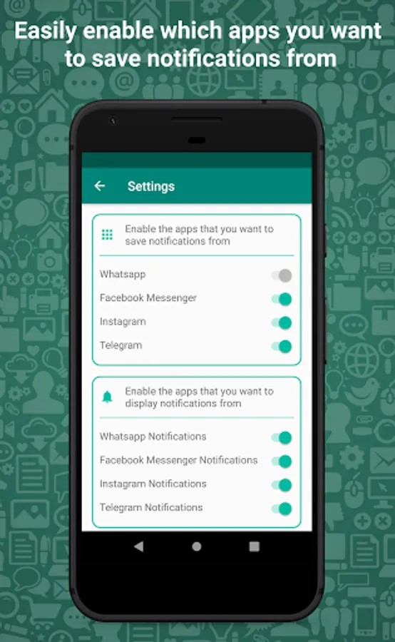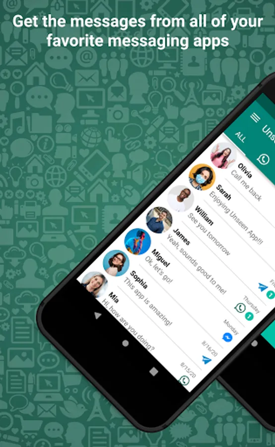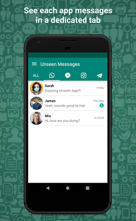 All the messages you receive on your device are encrypted and it is impossible to access them. Yet, you can allow an app to read your device's notifications and by granting such permission to Unseen you will have everything saved in a messages backup within your phone. Save notifications from Whatsapp, Facebook Messenger, Instagram, Telegram, and many more.