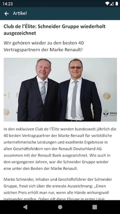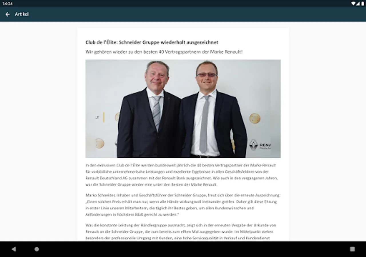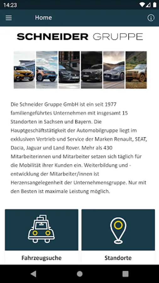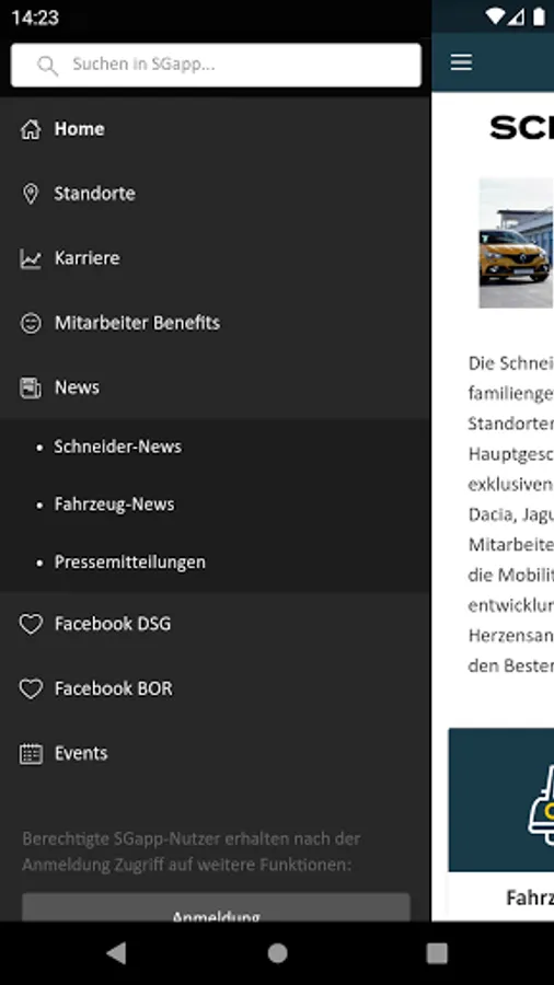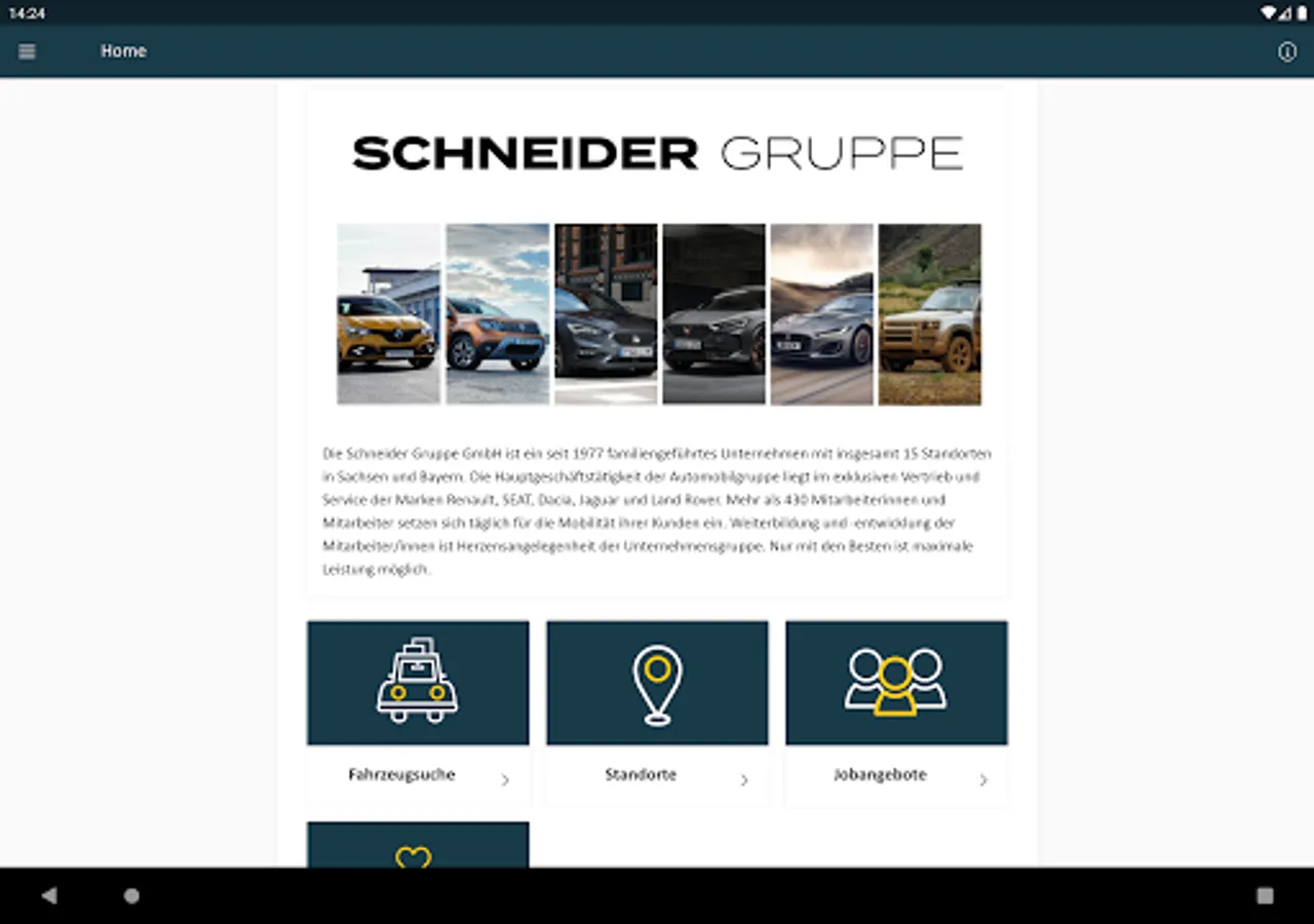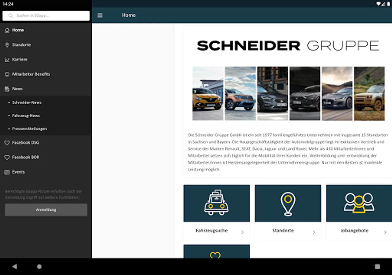 The SGapp is the communication app of the Schneider Gruppe GmbH. In the public area, it offers the most important information about the Schneider Group and news about its development. It is aimed at employees, customers and interested parties who want to get a general overview of the automotive company founded in 1977 and headquartered in Chemnitz.