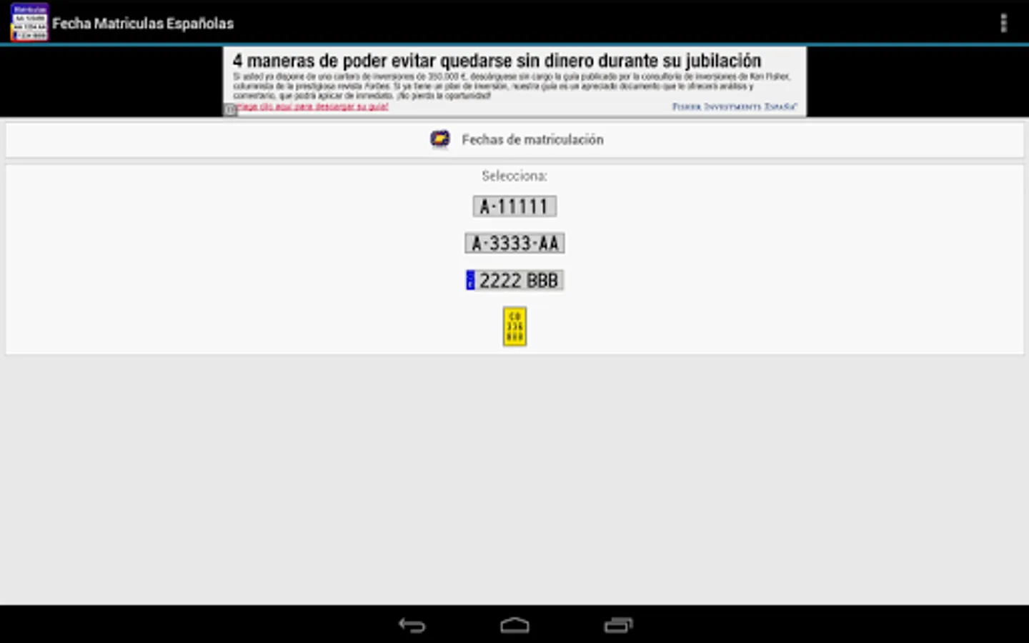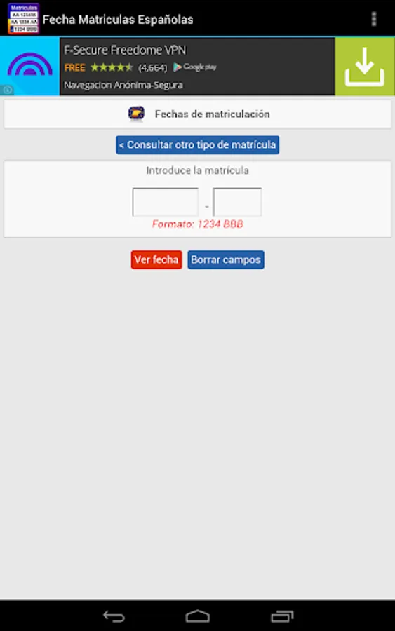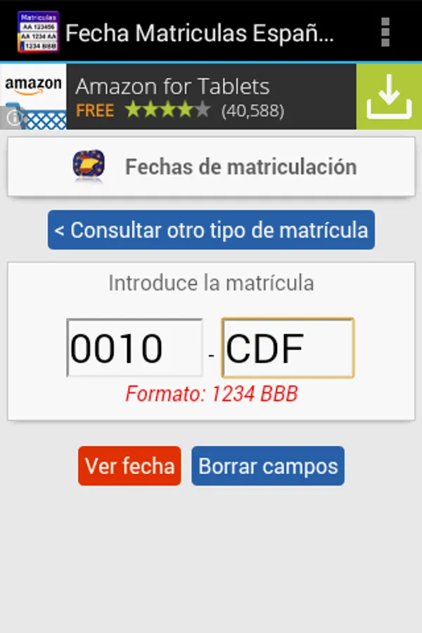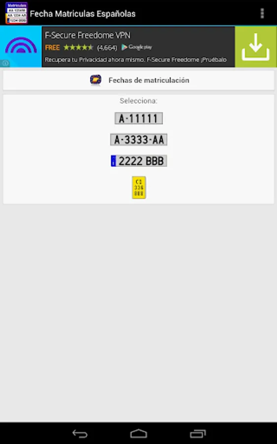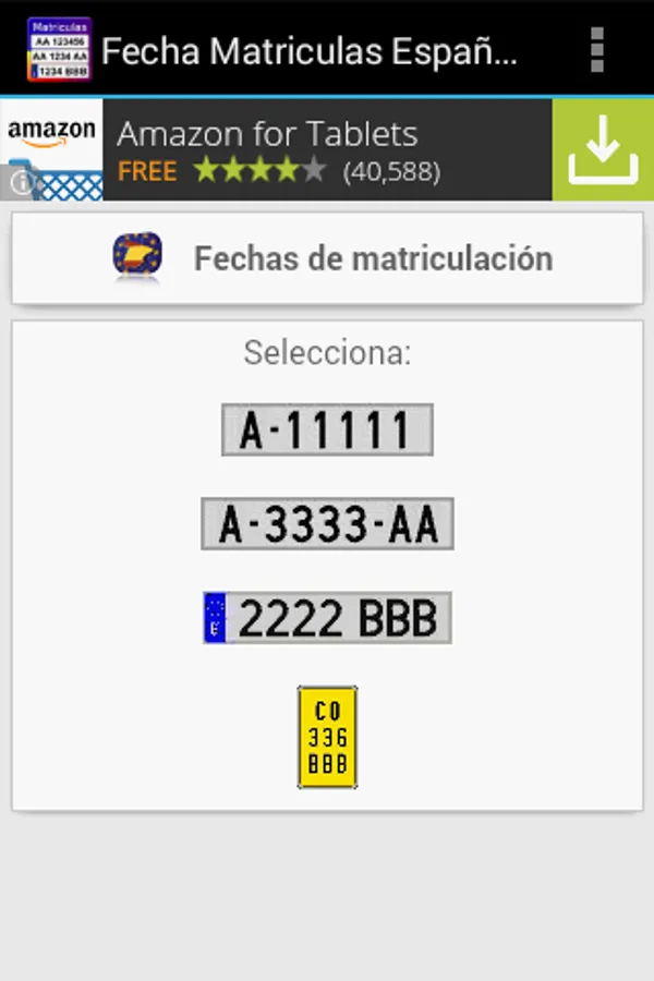 The only free app with all the dates of enrollment of Spain: State from 1900 to 2000, and Europe from 2000 to the present. To date provincial tuition gives the year of enrollment to date month year and European plates.