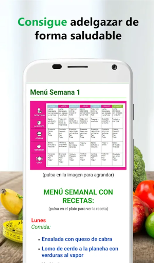 đ Healthy Diet for Weight Loss contains a complete menu for every day of the week. The menus included in the menu are structured by lunch, dinner, and if you press each dish, you can access in detail how to prepare it. Discover not only what to eat, but what you need to prepare and consume without excess.