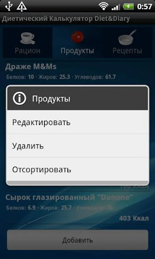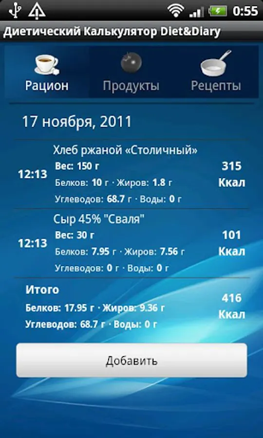 Using the search by the first letter of the product name, you can quickly add to your diet eaten on any given day. Also you can find a product by scanning its barcode camera. To add a product or recipe in the diet is sufficient to know its weight - the nutritional value of the product (protein, fats and carbohydrates), the program will calculate your own. Scroll through the phone's screen to the left or right, you can choose a diet for yesterday or tomorrow and edit it when planning your menu for the future.