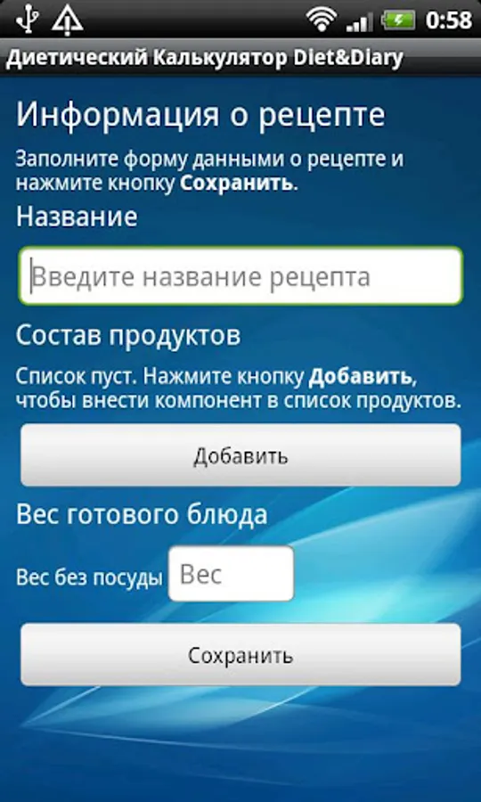 You can add, edit and delete their own recipes. The program allows you to automate the calculation of calories your meals. Meals are added to your diet in the same way as a simple product.