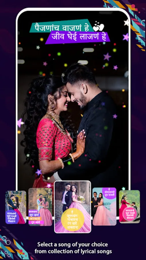 My Photo Marathi Lyrical Video Status Maker have great collection of Marathi song lyrics select your favorite lyrics and add them on your pictures and make lyrical video of your own pictures and share your feelings with your love using your photo lyrical video. Create 30 seconds lyrical video.