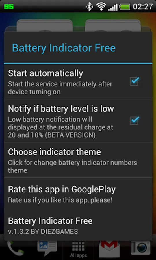Battery Indicator Free - it's easy , free app that shows information about the battery in the status bar.