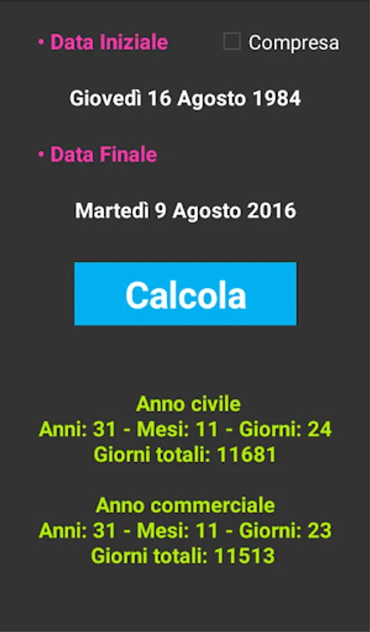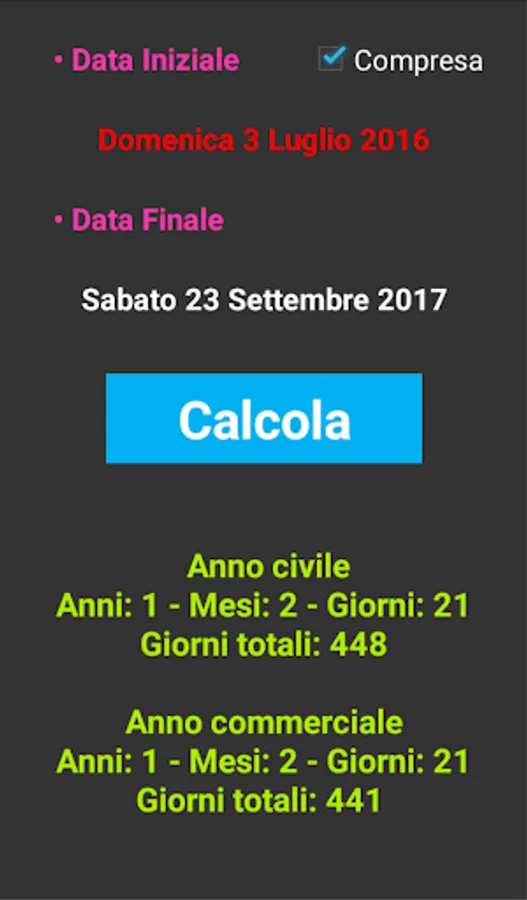 For the calculation, both the calendar year is used, i.e. the year made up of 365 days, as it actually is, with the actual calendar days taking into account the months made up of 30, 31 or 28/29 days, and the commercial year, which, by convention, is made up of months of 30 days. The commercial year, therefore, appears to be made up of 360 days. In the calculation, the exclusion or not of the starting date can be optioned.