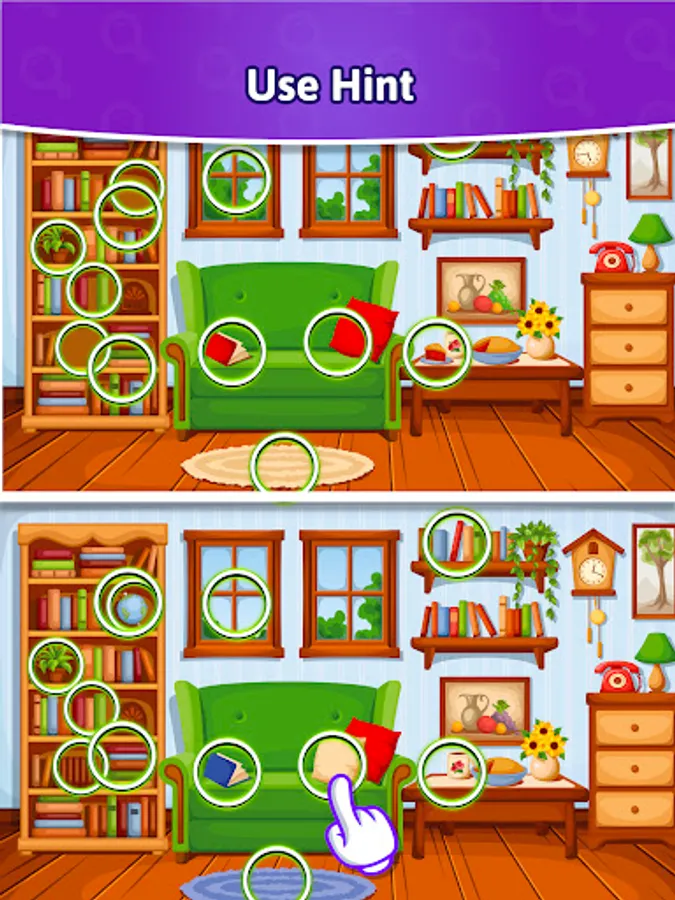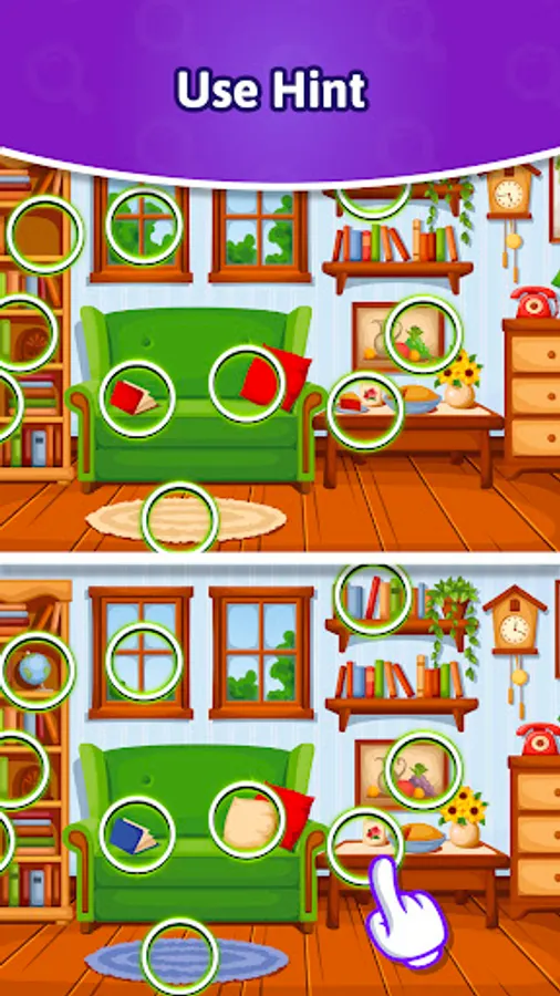 - Use hints when you need a clue during your hunt for differences.