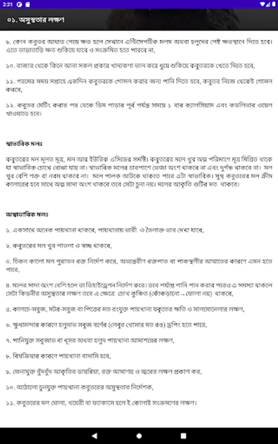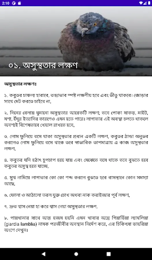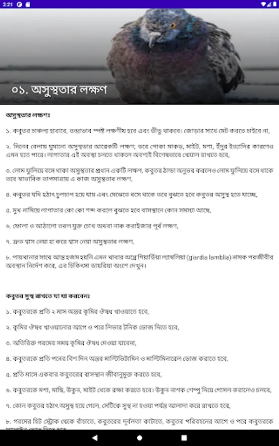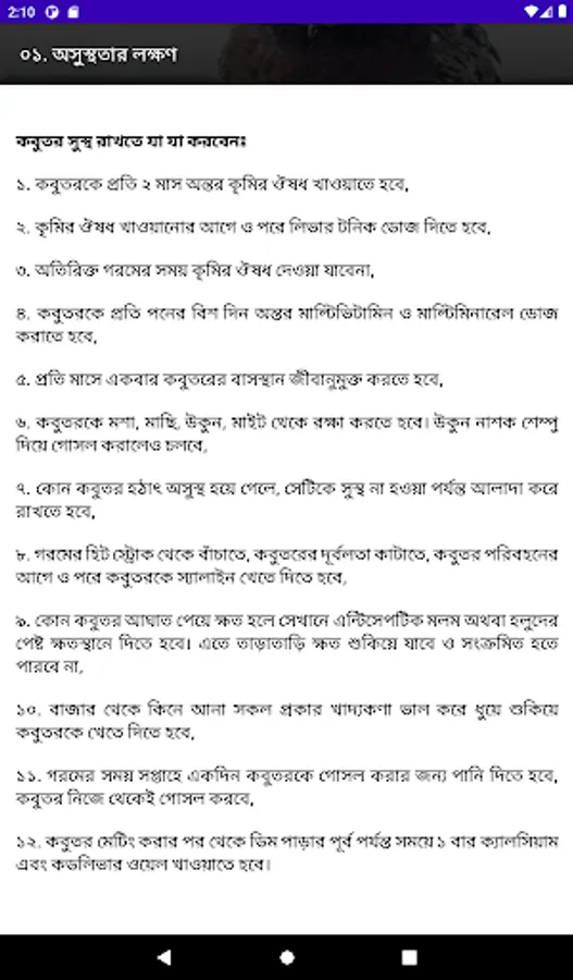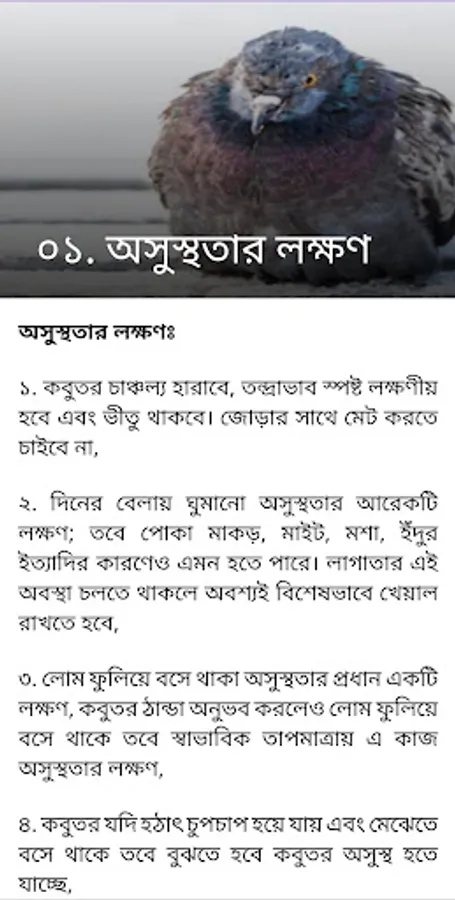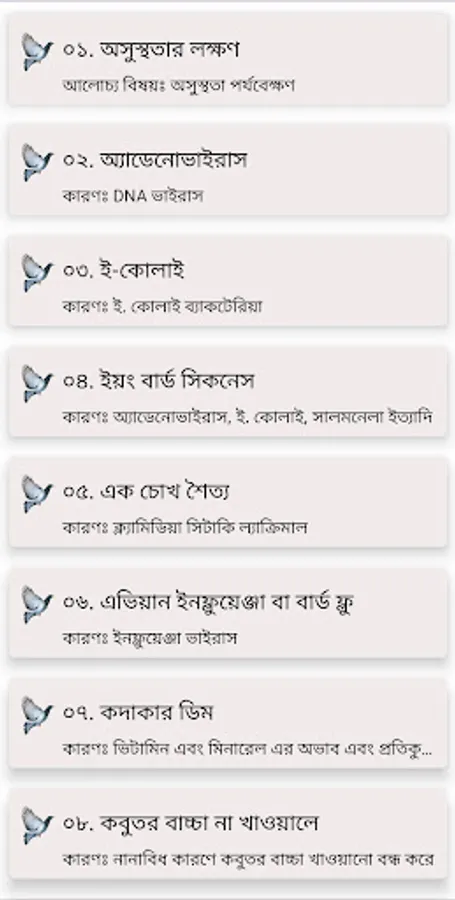 The following six issues have been highlighted separately for each disease of pigeons: