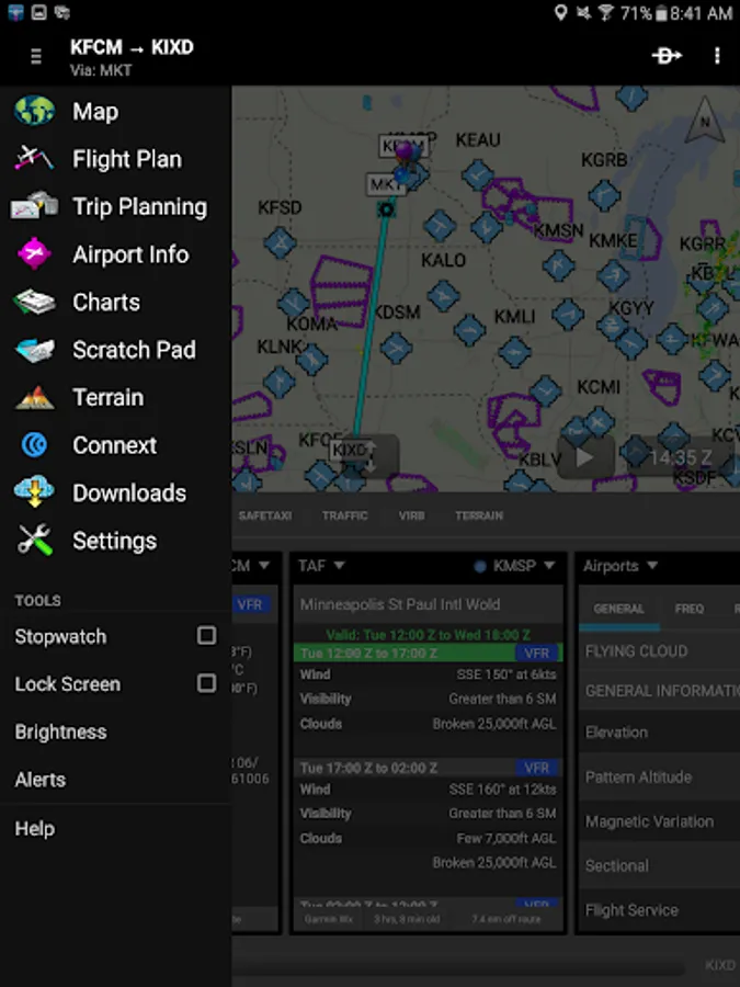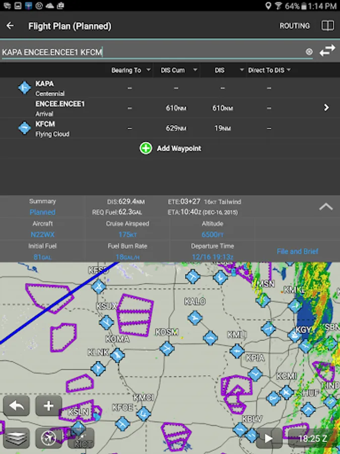 Garmin Pilot’s powerful capabilities start with pre-flight planning, providing pilots with the most comprehensive aviation weather information to make better-informed flight decisions. Pilots can check NEXRAD radar, visible and infrared cloud imagery, METARs, TAFs, AIRMETs, SIGMETs, PIREPs, NOTAMs, winds and temperature aloft, PIREPs, TFRs and lightning data. With Garmin Pilot, data can be displayed over a VFR sectional or an IFR low or high en-route chart to visualize the weather for your route. Add text-based weather widgets and use the exclusive NavTrack feature to view weather along the planned route.