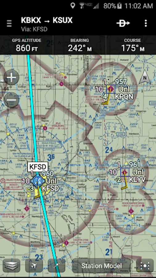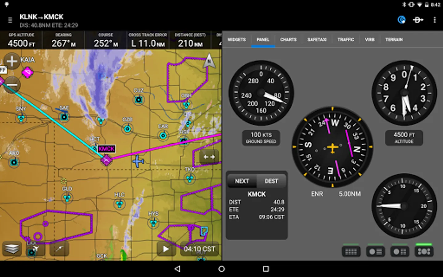 Garmin Pilot provides full en-route navigation capability on its moving map, while showing ETE, ETA, cross track error, distance to waypoint and current position.