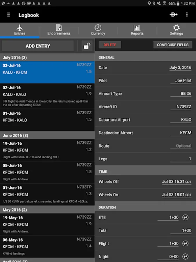 Garmin Pilot includes a comprehensive electronic logbook that syncs with flyGarmin. The logbook automatically generates entries based upon GPS data collected during the flight, tracks currency, supports manual entries, endorsements and creates reports.