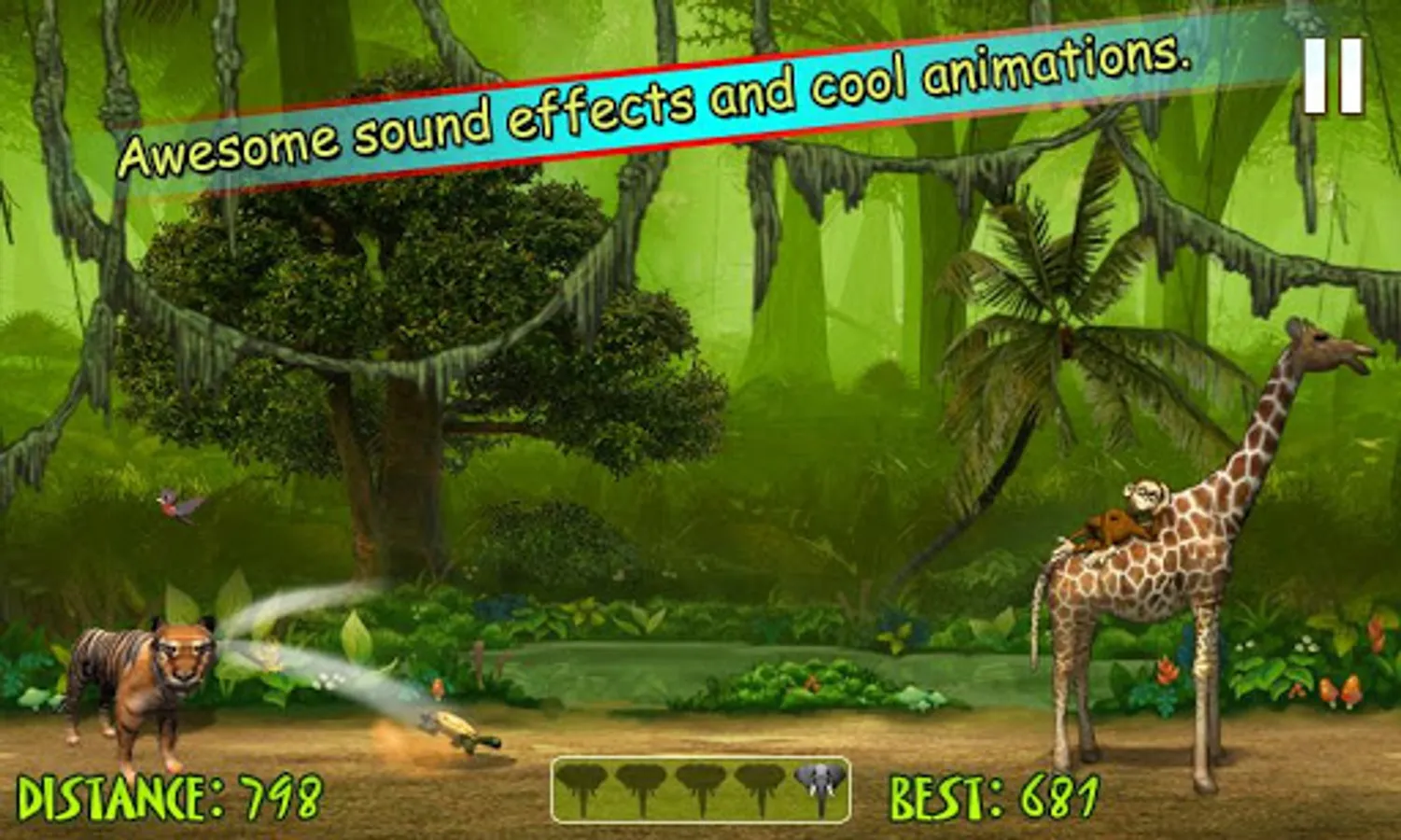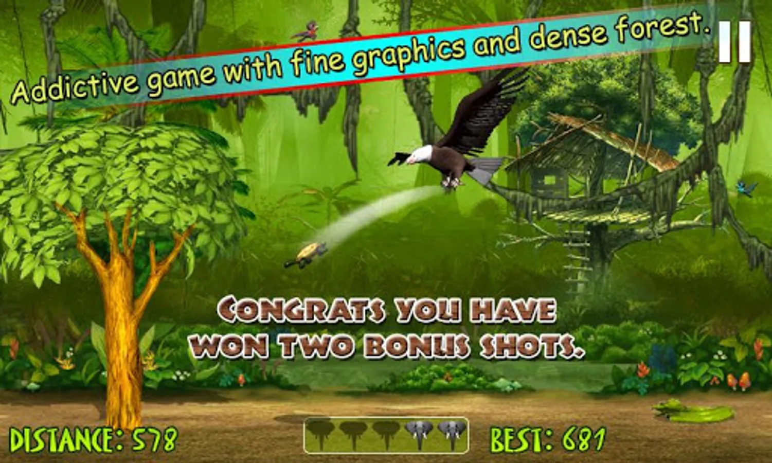 In this strategic game Jungle Joy, you have to play as a funny elephant. Choose rabbit or turtle to play with, take him in your trunk and throw as far as possible to achieve the highest points. You have 5 shots to throw. If you achieve a certain distance you will get bonus shots to score more points. There are lion, snake, gorilla, giraffe, tiger, tree and eagle, out of them some are your friends to help you score more and some are there to stop you making high scores. Just make a perfect combination of angle and power to throw them longest. Enjoy this addictive game with fine graphics, dense forest landscapes and more. Beat your own records of throwing them in this adventurous game.