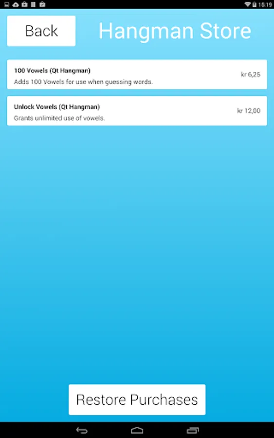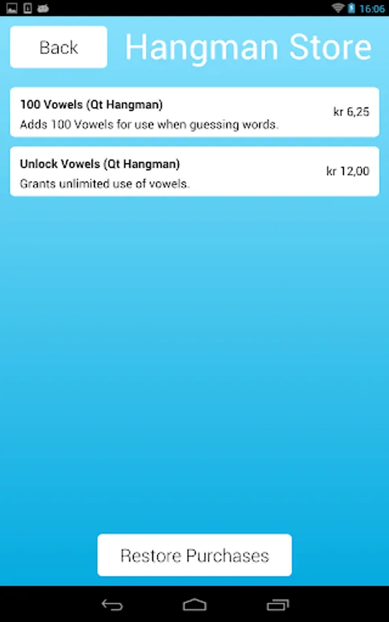 The demonstration is done in the form of a traditional hangman game where you have to pay for vowels. Note that since there is no way of demonstrating in-app purchases without charging money, any purchase made in the game will be real.