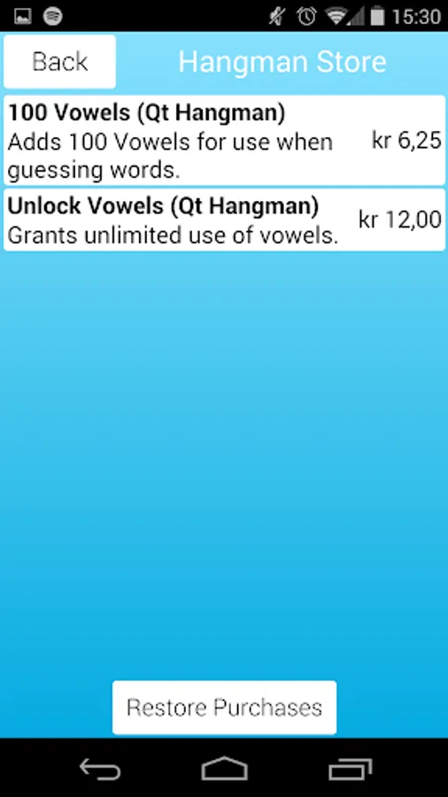 We recommend that instead of actually purchasing vowels inside this official release, download Qt and run the example from the Qt Purchasing module against your own store entry where you have registered as a test user. You will then be able to test the purchasing functionality without actually paying.