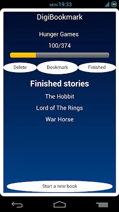 Started a new book? Enter the book's name into DigiBookmark app and each time you finish reading click on the "bookmark" button to save your current page position. When you finish your book then it will be saved in your finished books list.