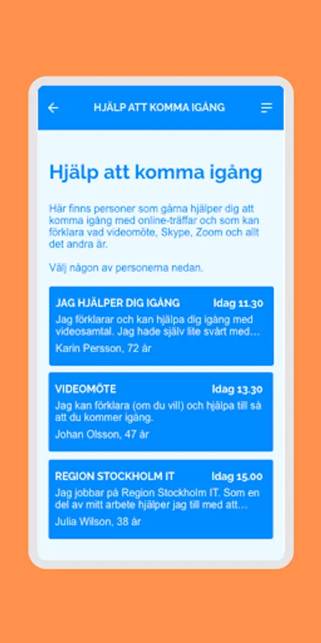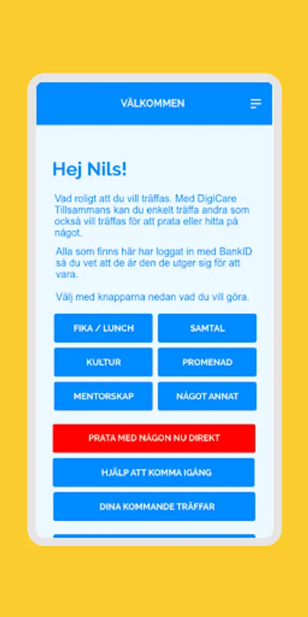 Once you have entered the app, you can easily see which digital meetings are available or start your own meeting. You and everyone else log in with BankID so that you probably know that others you meet are who they pretend to be. No registration required. We meet safely and easily.